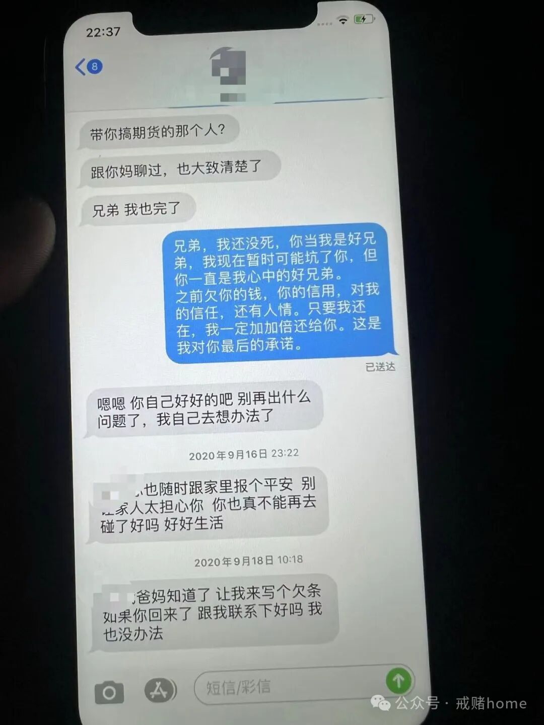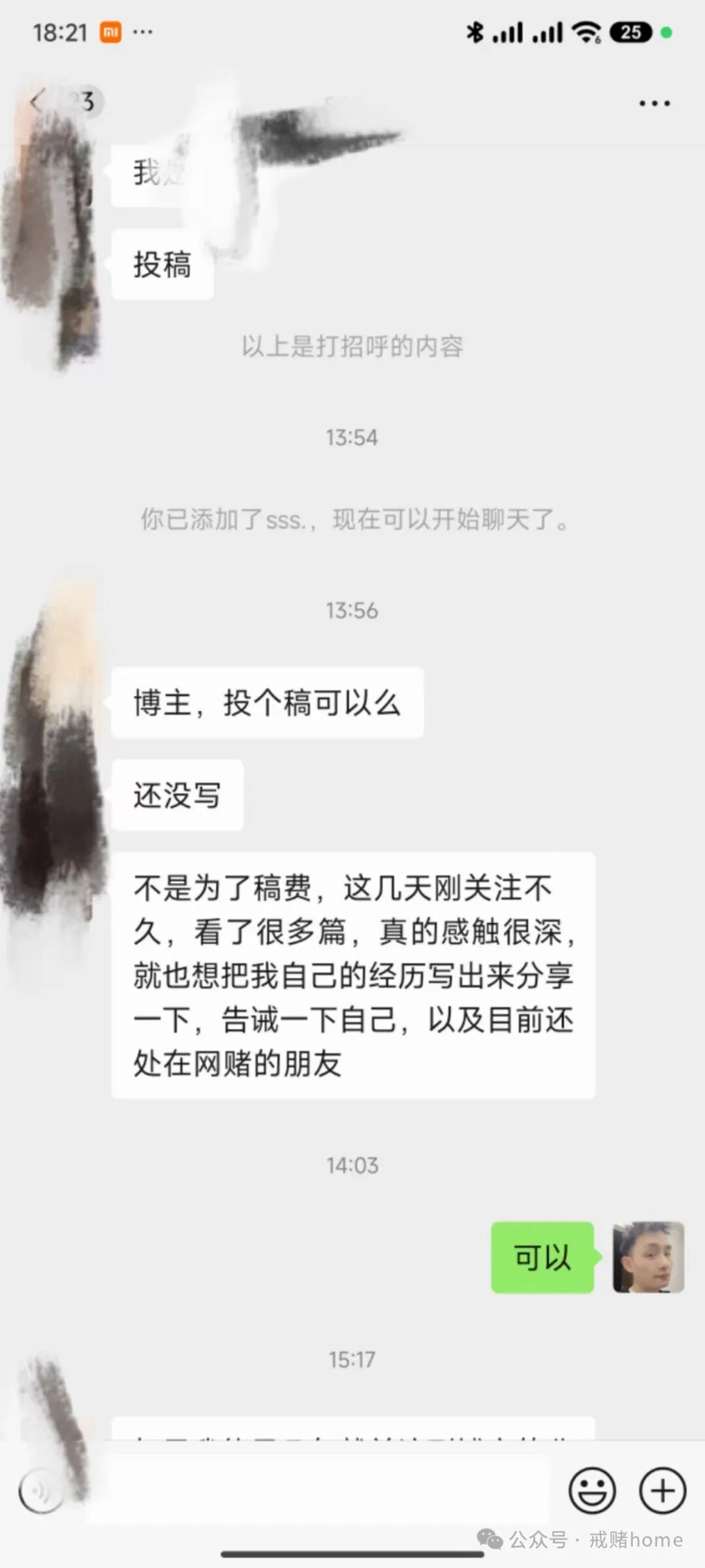如果我能早几年就关注到博主的公众号,或许我就不会陷得那么深。真的,感触非常非常深,看着其他老哥们的经历,仿佛看到了几年前的自己,赌博这东西一旦沾上,很难戒,轻则负债累累,重则家破人亡,想必大家看了很多投稿也都见识到它的危害了。