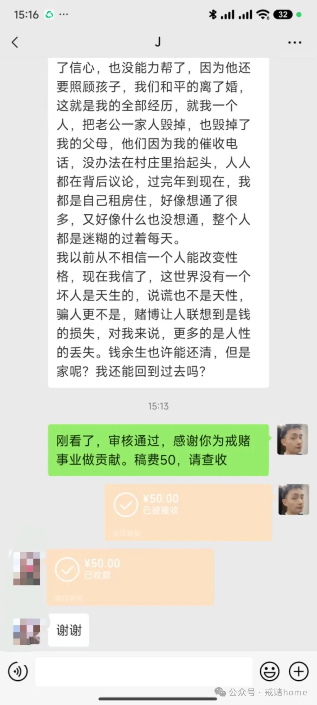 我以前从不相信一个人能改变性格,现在我信了,这世界没有一个坏人是天生的,说谎也不是天性,骗人更不是,赌博让人联想到是钱的损失,对我来说,更多的是人性的丢失。钱余生也许能还清,但是家呢?我还能回到过去吗?希望我的经历,能让大家意识到赌博的危害到底多大,你越不甘心,代价就越沉重,直到最后家破人亡。