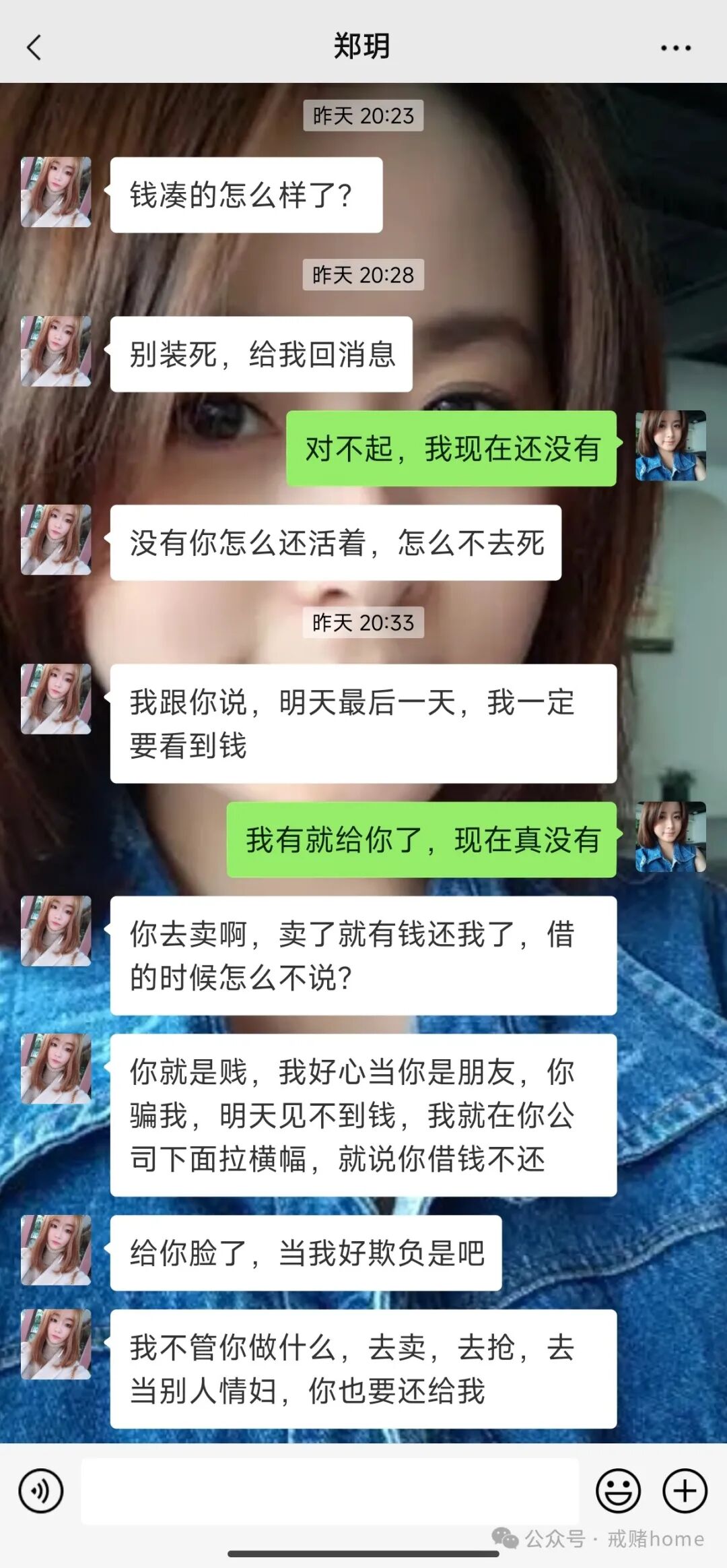 每个可怜的人,都做过一些龌龊的事,所以才不值得可怜。上面那张图,就是以前经常打牌的牌友,我差她12000,当时说要还信用卡,实际被我拿去赌博,答应一天就还,现在拖到这么久。她对我的恶语相向,虽然我理解,但真的很痛。语言伤害,跟一把大镰刀一样,时刻砍着我的大动脉,鲜血直流,让我分分秒秒都陷入到痛苦和内疚之中,我不是不愿意还,而是现在我真的没这个能力。