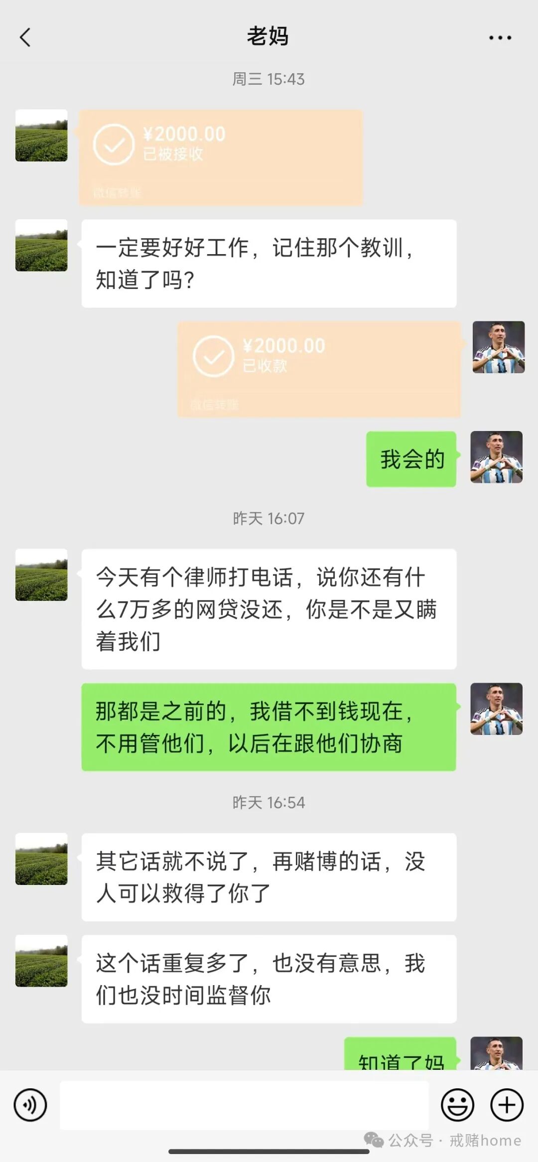 每一个当下,赌徒想的事情不同,开始担心项目资金输没了不好交代,再到后面只想要把车搞回来,创业可以说赔了,可是车这个东西,无法交代。所以第一次坦白出现了,我本来以为父母会对我各种批评,但是并没有,甚至都没提让我回去,挂完电话后的半小时就把钱转回来了,没有一句废话,只是告诫我,走错路是每个人的都要经历的,你也受过高等教育,也不小了,这次一定要长个记性。有了钱,车赎回来,手里还有十多万资金,根本不把昨天前天输了多少钱放在眼里,又复活了一样,我一遍又一遍的分析自己的赌法是不是存在问题,之前能连赢一周,现在总不至于见鬼了吧,足球是给世界人看的,不存在为了我一个人大费周章的表演,所以我打算再尝试最后一次,这次十万再赌进去,我就老老实实回家帮忙去。