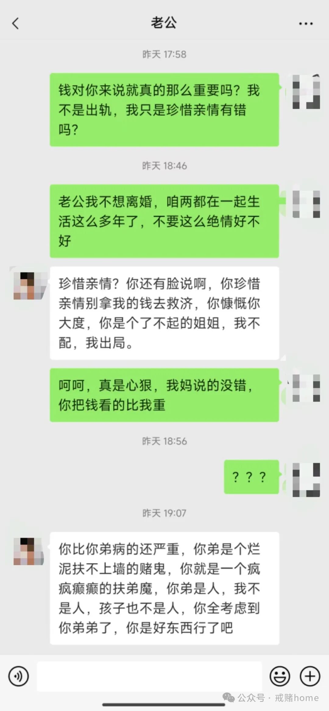 然后呢,订婚也没有进行,他说感情不和分手了,具体什么原因,我猜测大概率因为赌博。然后长达一年多的时间里,多次跟我要钱,我无法计算到底有多少次,要么几百,要么几千,也用同样的方法,跟我母亲要钱,我爸发现很多次,劝我妈别再管了,再管下去家破人亡,但我妈不听,哪个当母亲的愿意看着自己的孩子受苦,我妈经常打电话跟我诉苦,我也感同身受,自家人不帮自家人,那就没人能帮了。我也看过一些案例,说赌博到最后可能会自杀,想到这里,我就经常失眠,我怕我弟跟那些人一样,最终承受不了压力选择极端,所以在后面的时间里,我常常拿老公的钱,也被发现了,吵架,我说他没良心,他说我已经疯了, 当然我知道自己的做法极端,我会道歉保证。