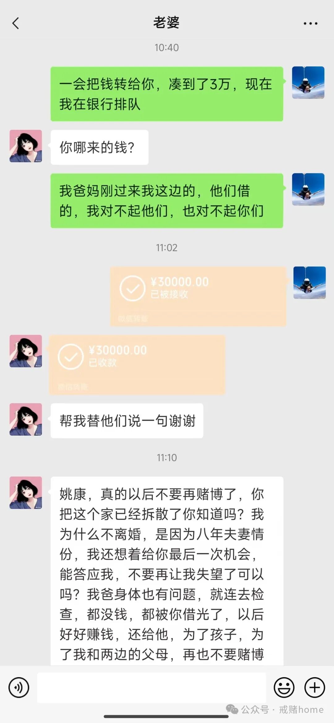 今天上午,有人敲门,我以为是房东来催租了,结果是我爸妈来了,我们隔着一个县,我也不知道他们是怎么来的,想要从我老家来到这里,起码得转几趟车,我还没开口问他们怎么来的,他们就提着一个红色的塑料袋子,里面装着3万块现金,颤颤巍巍的交给我,他们说不放心把钱直接打给我,怕我又赌掉了,我听到这句话,心被刀子割一样的难受,还说一会要陪着我,监督我,把钱存到银行,然后在微信转给我老婆。老哥们,我是多么的无地自容,我是把父母伤害得有多深,我简直就是禽兽。最终,父母陪着我,全程亲眼看着我把钱存进去,再把钱转给前妻,他们才放心,连饭都没吃就回去了,怎么挽留都不愿意待一夜。
