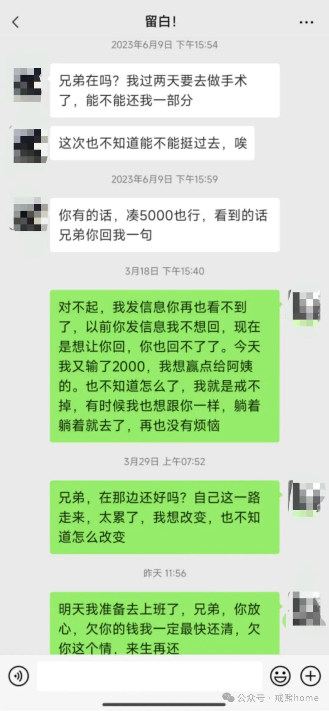 我那生重病的朋友,我也不知道到底什么病,欠着2万块,拖了四年没还一分,人家卑微求我,让我还他,最后做手术都没下来人就离开了,这笔钱我都没还。有些痛苦只有清醒的时候才能感受,人醒了,你以前干的那些缺德事,都会一幕幕的展现眼前,而赌博的时候,是看不到自己的问题,反而把催债的那些人列为不友好的人,还把自己赌博输钱责怪到那些讨债的人身上,要不是他们?我又怎会赌博,我当时就是这样想的,也不怕大家来喷我,那时候的我,赌博也要给自己找理由,输完了还要给自己找个台阶,反正自己就是没问题,有问题的全是别人。