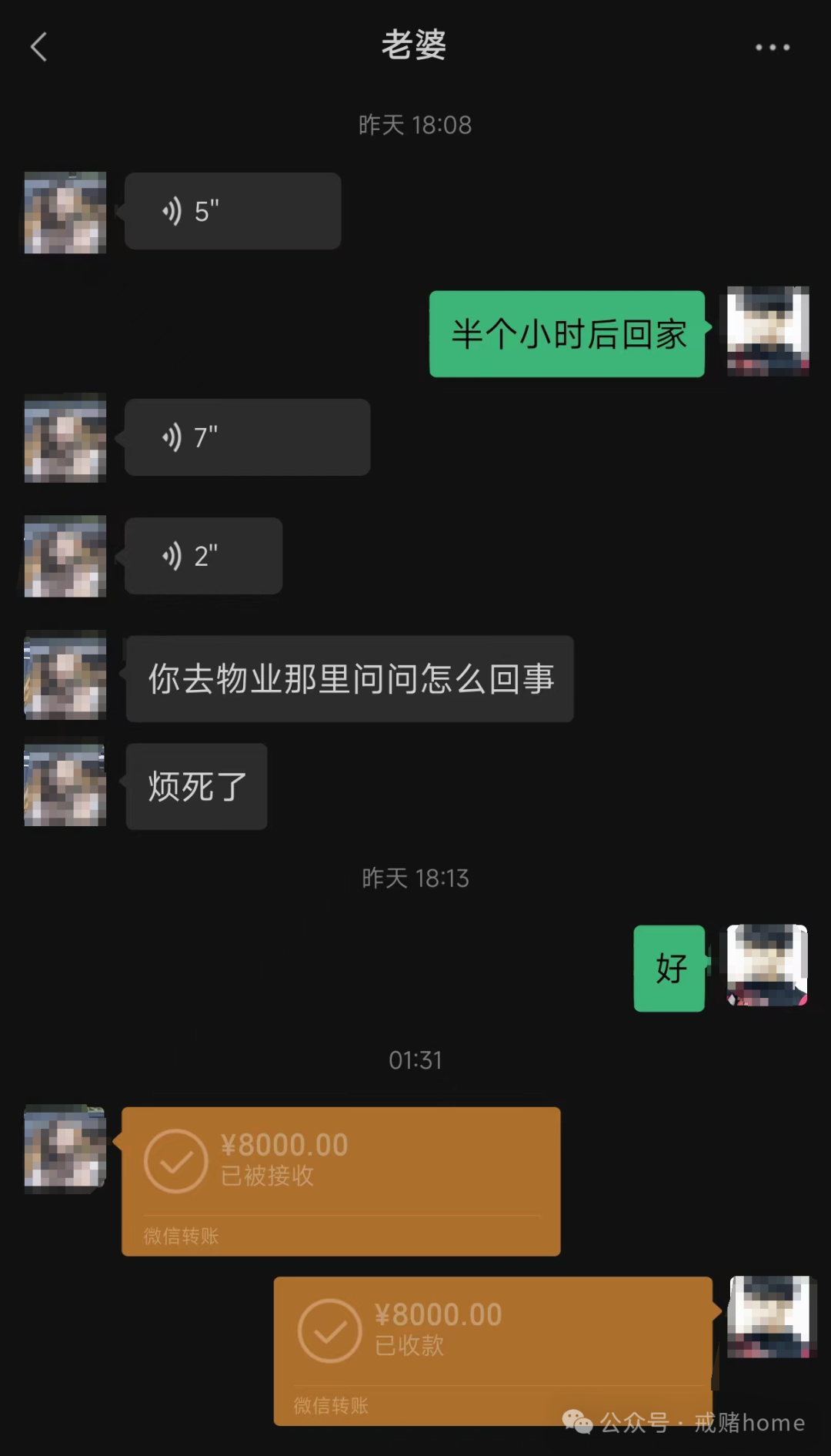 以前她为了防我,把密码改了,后来看我没有继续了,就对我放松了戒备心,这钱还没到十分钟就输了,也全部是她的工资。我的工资全部拿去还账,她的钱用来家庭开销,转完钱后,我把她手机里的记录删除了,不过有什么用,微信一共8070,现在就剩70块,早晨醒了只要看手机就会发现。真的赌到最后,什么也管不住,球赛就剩10分钟,我都要去博一把,拿什么去冷静,我也许离婚了才能冷静。