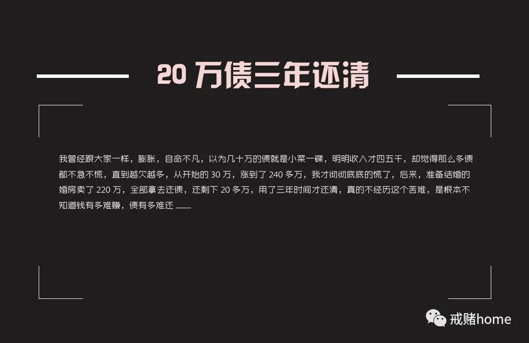债多,收入少,很多人熬不过去,最后又频频复赌,虽然我不明白为什么那么多人有这想法,但可以肯定的是,他们受到的伤害没我大,还没到不得不戒赌的地步,我实在是被逼的走投无路了,再赌下去势必会家破人亡,所以只能戒赌,幸亏后面的三年我一次没碰,不然现在也不可能上岸。房子没了,但是我做回了一个正常人,家庭和睦,这些比钱重要太多了,我也从戒赌以后没说过一句谎话,对人坦诚,现在跟别人借钱,那也是一句话的事情,因为我用实际行动挽回了自己的信誉。