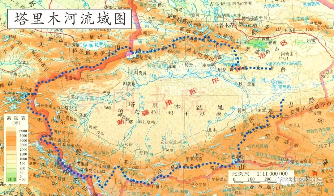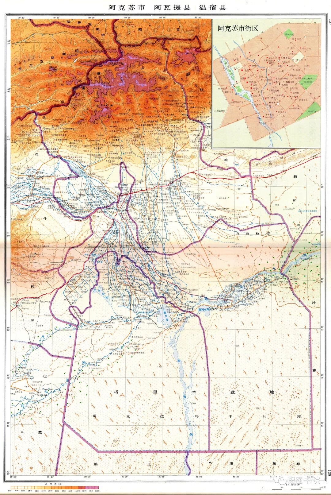 (塔里木河中游附近地形图,这里是喀什噶尔河,叶尔羌河,和田河,阿克苏河交汇处,北方罕见的上游多河汇集区。图中黄色虚线是干河床,这是河流摆动的痕迹。阿克苏市是塔里木第一城)