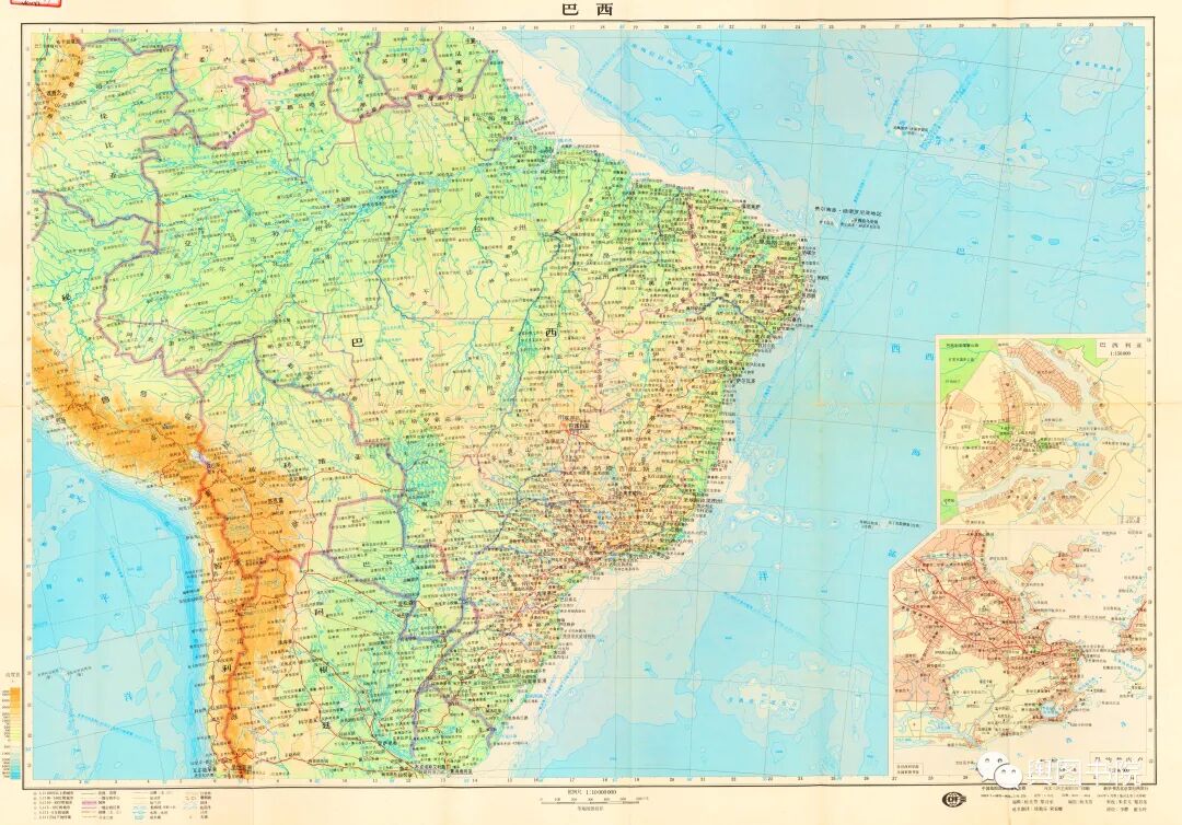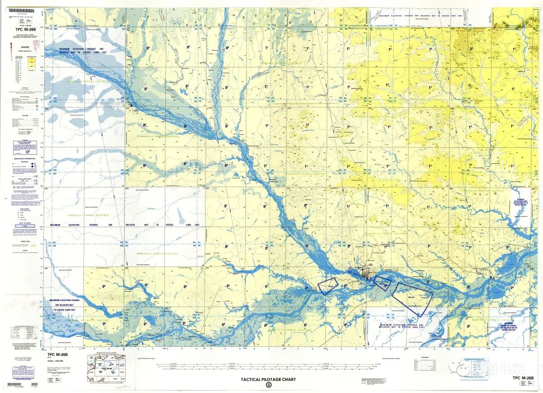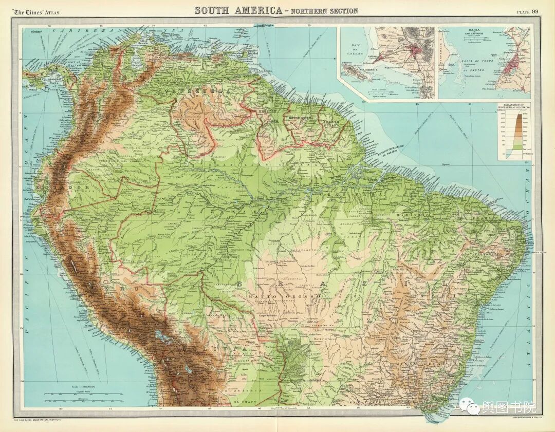 (亚马逊河中游附近地形图,比例尺1比50万。我们从图中的蓝色区域和河床描绘可以看出河流摆动的痕迹和范围。这里位于亚马逊河和内格罗河、马代拉河的交汇处,图中城市马瑙斯被称为亚马逊第一城,正好对标塔里木河的阿克苏市)