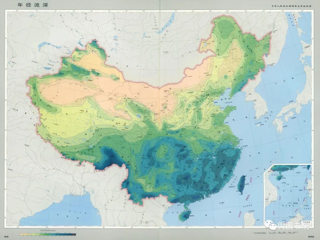 (中国年径流深,1999年,雅鲁藏布江大拐弯附近是径流深最大的区域,在全国图中也很醒目。值得注意的是,径流深的南北差异比降水量差异更大,这里也能看出南北水资源的不均)