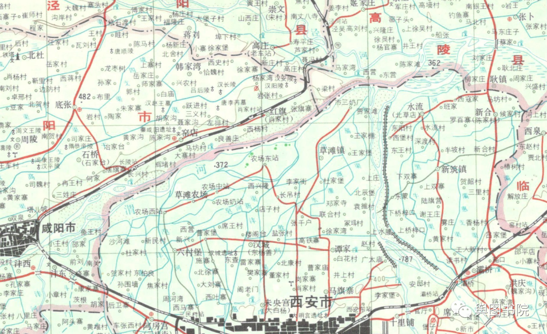 (原版的“泾渭分明”所在地,泾河和渭河交汇处,底图:1976年陕西省地图集)