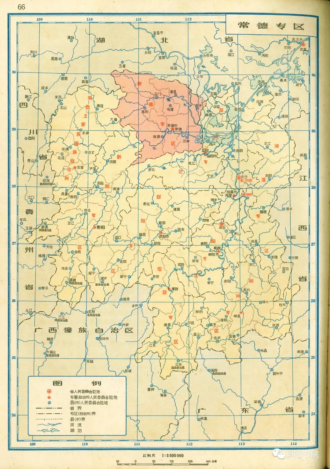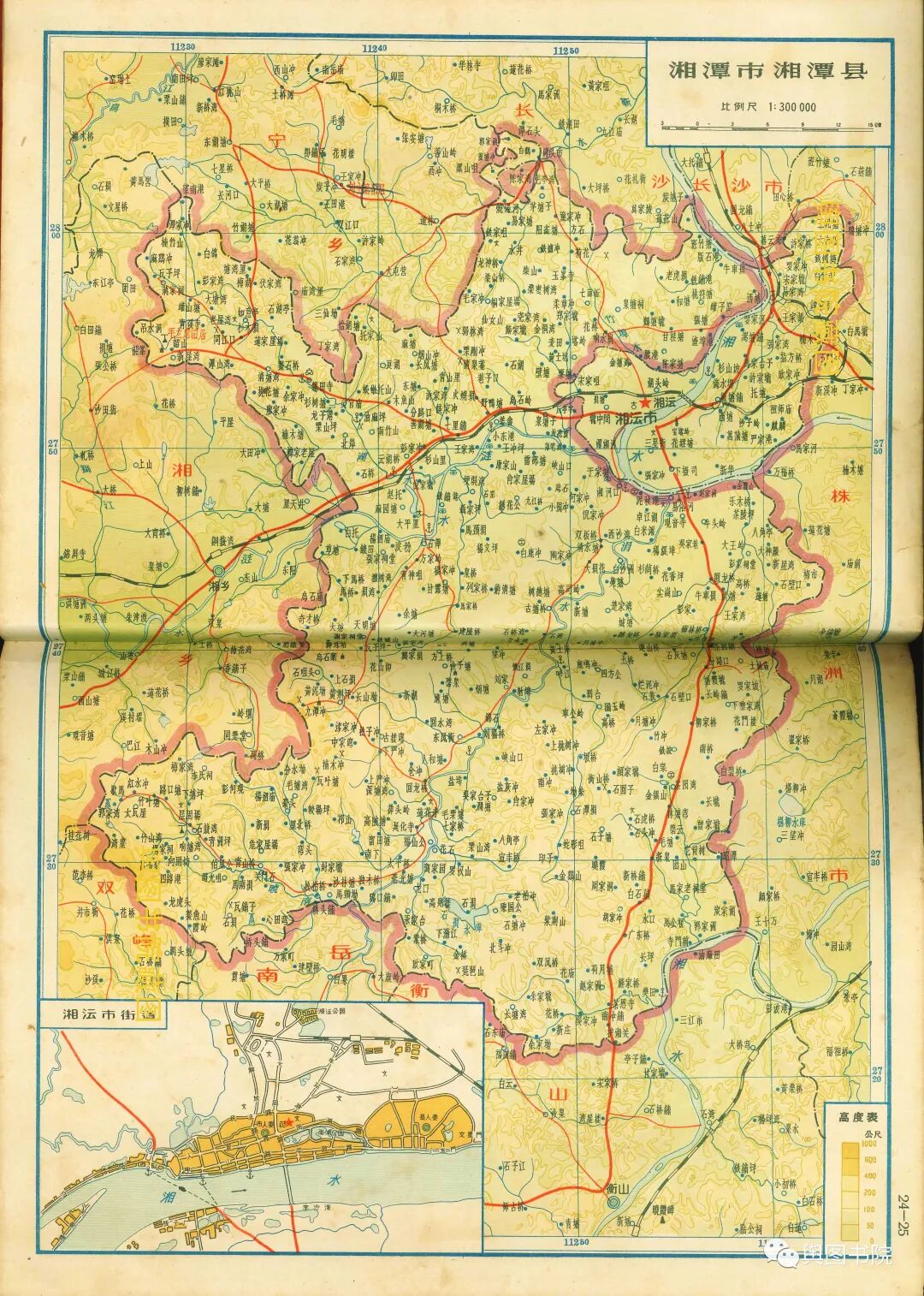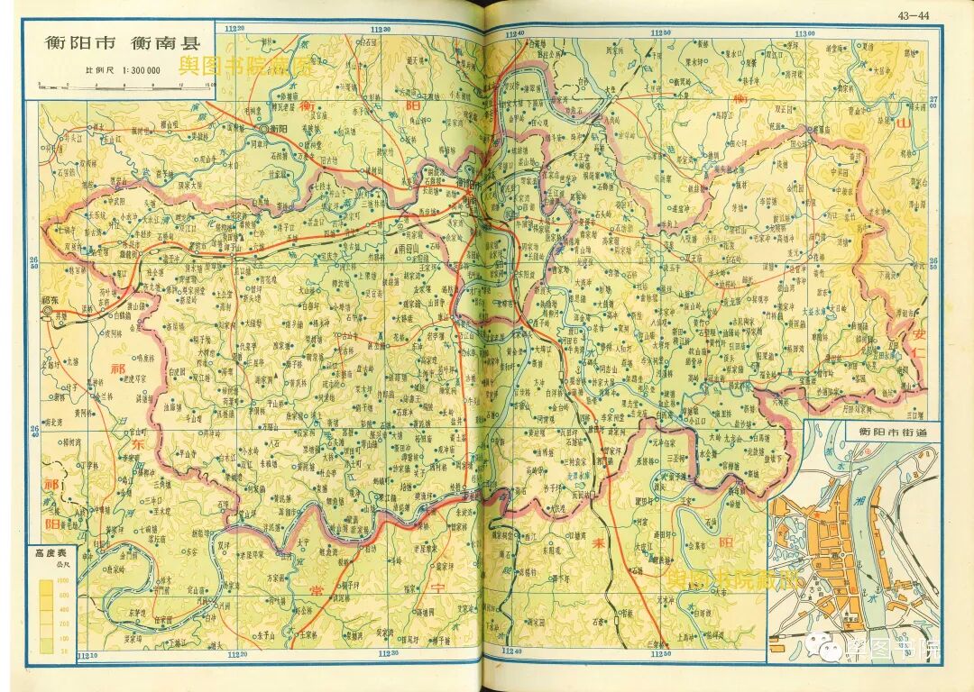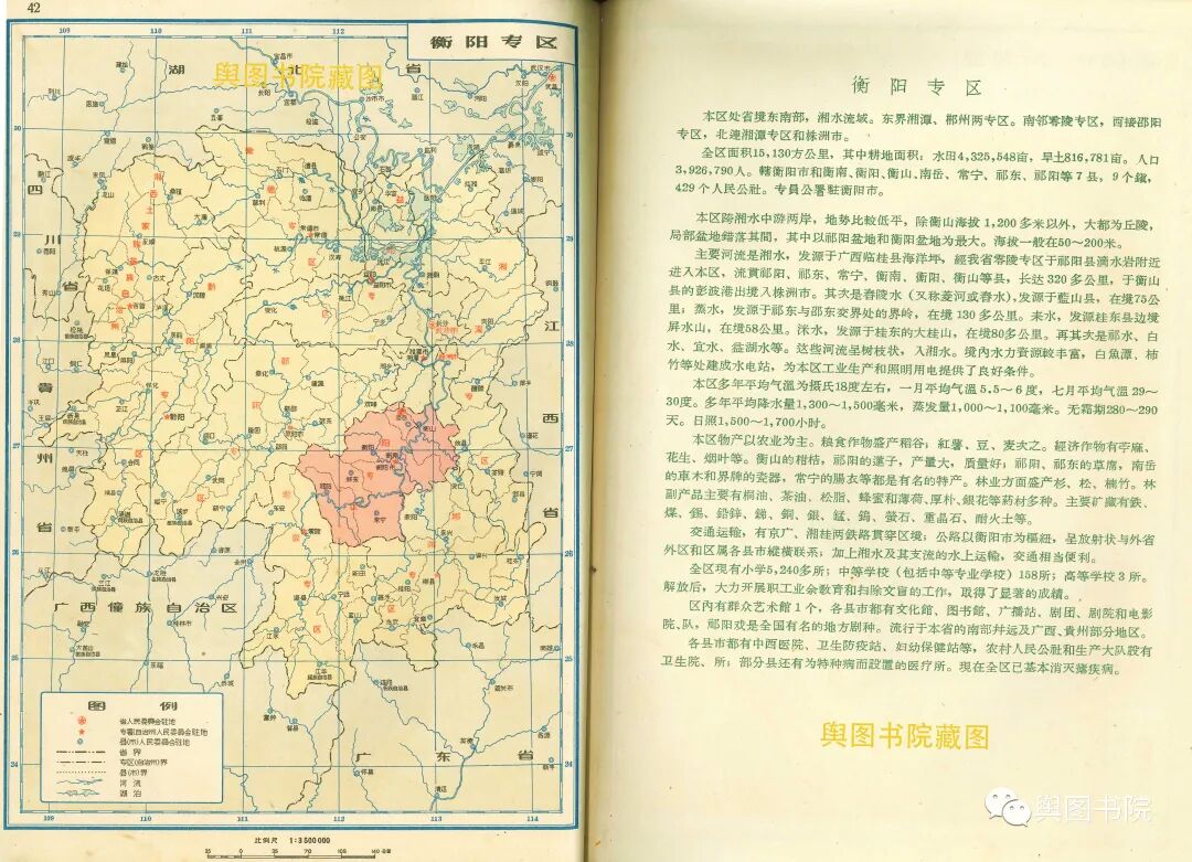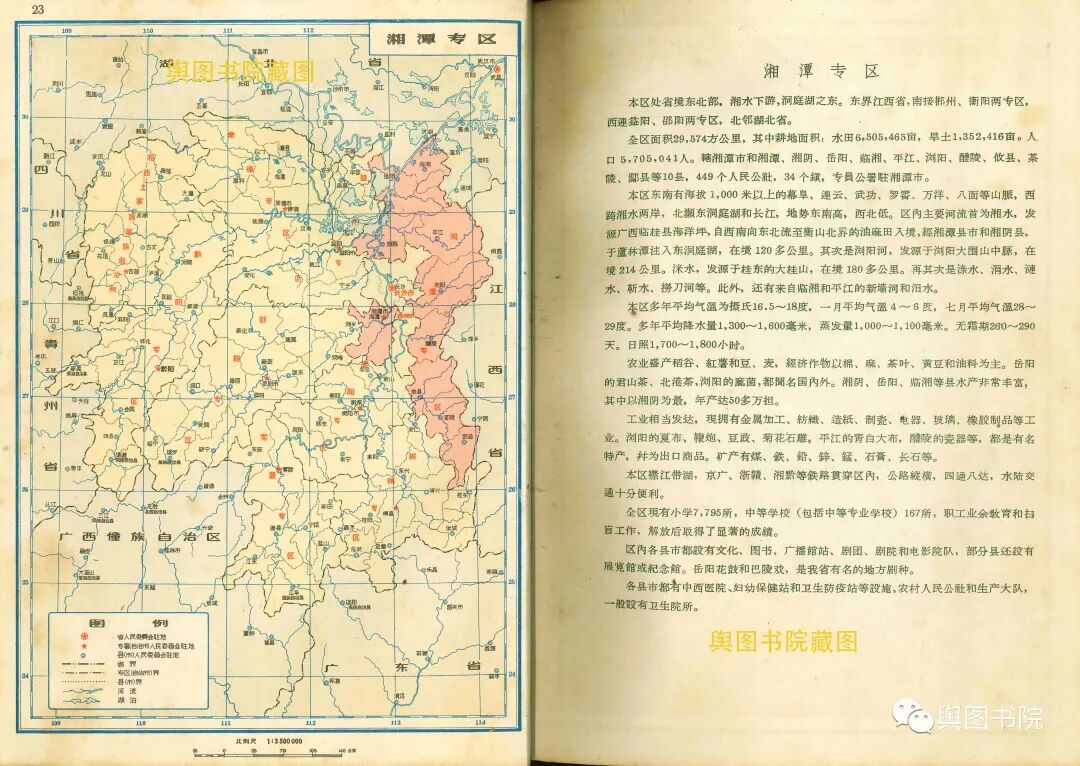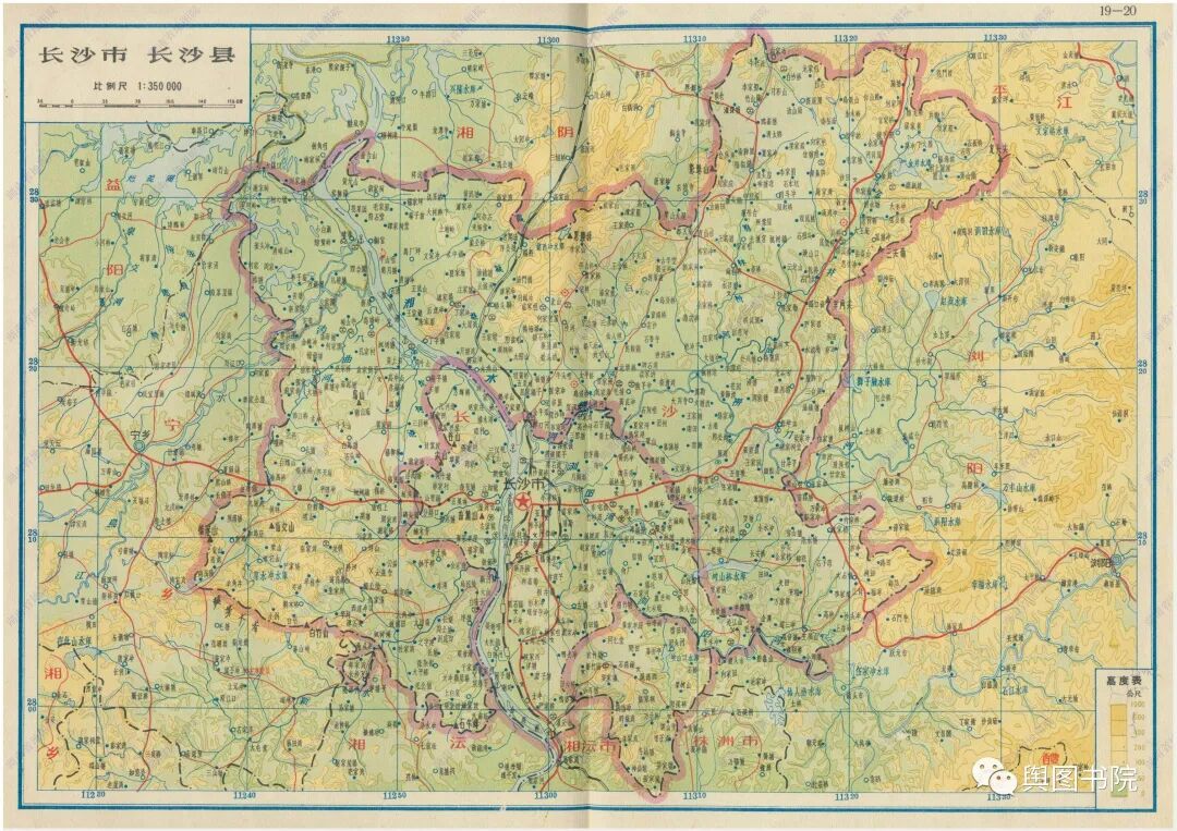 湖南省地图集分专题图和普通地图部分,专题图介绍了湖南省地形经济交通概况,普通地图一县一图,是非常珍贵的等高线分层设色地形图,而且是固定比例尺,制图相当细致,无比精美。我们今天欣赏第一部分,省的专题图,和省辖市(长沙,株洲),以及湘潭,衡阳,郴州,常德这些专区。