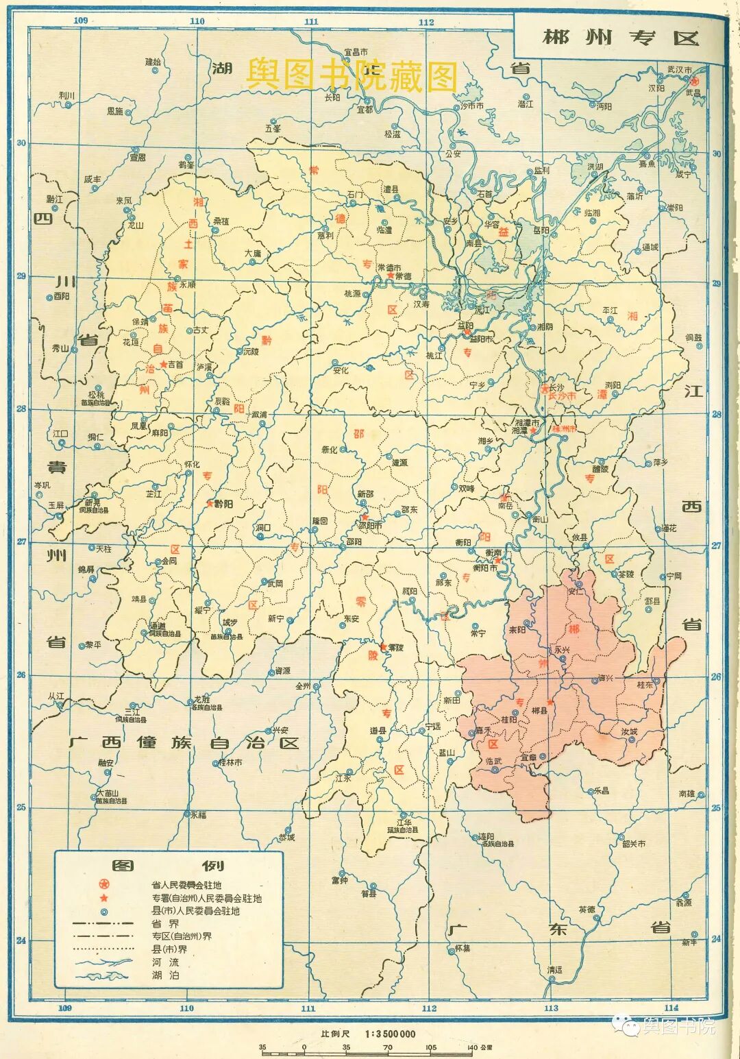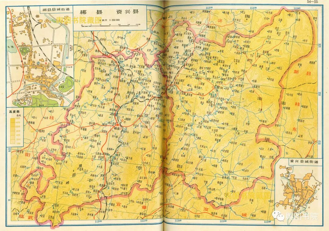 郴州专区驻地郴县,在建国初曾设置郴州市,但是在地图出版的前一年,郴州市撤销。资兴县也短暂设置过东江市,不久也撤销。