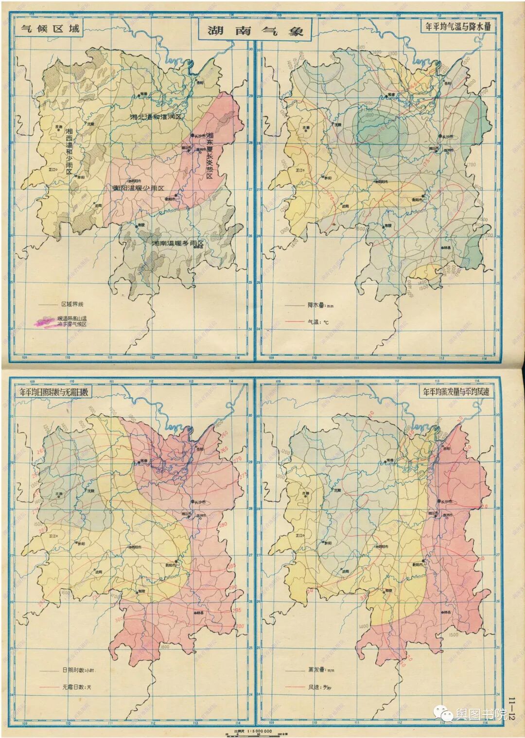 湖南整体来说,处于温暖而湿润的地方。由于当时气象数据有限,温度和降水图显得比较粗糙,不过还是可以能够看出大致分布趋势,就是中部稍微干旱一些,边缘湿润。气温的话,主要受地形影响,海拔低区域温度高,不过湖南受小地形影响比较大,在局部地区有一些反常区域。