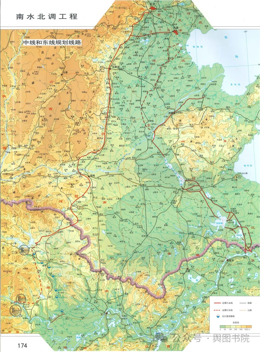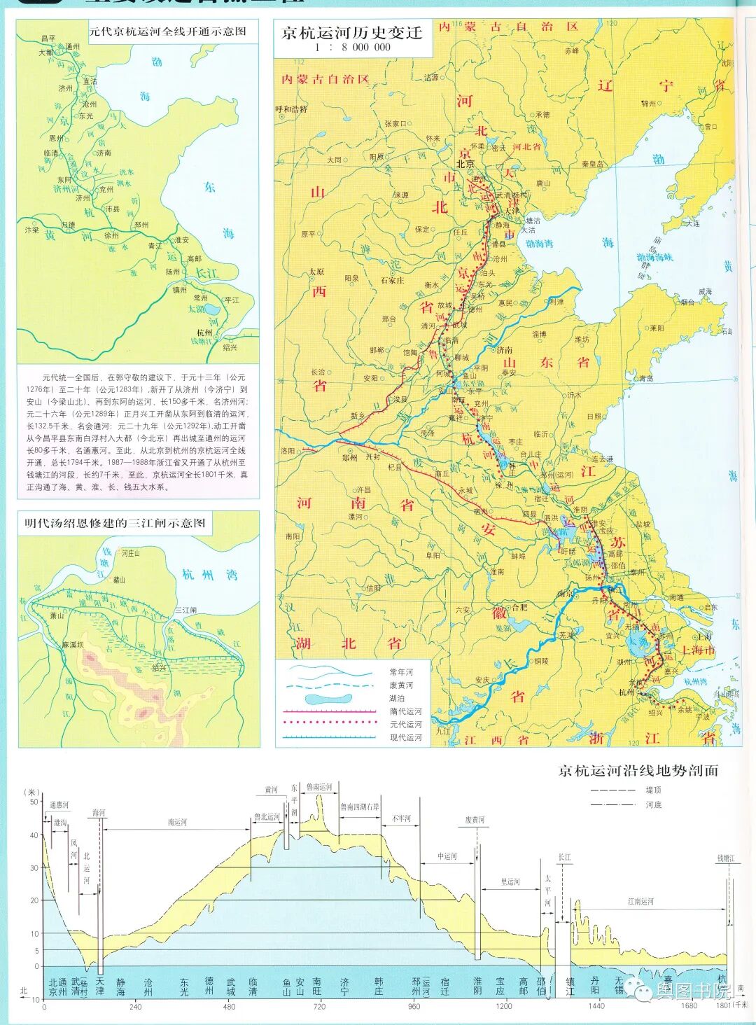 (京杭运河变迁和河底剖面。在今天,运河承担了东线调水渠道职能。由于黄河附近河床海拔高一些,这里需要扬水实现南水北调)