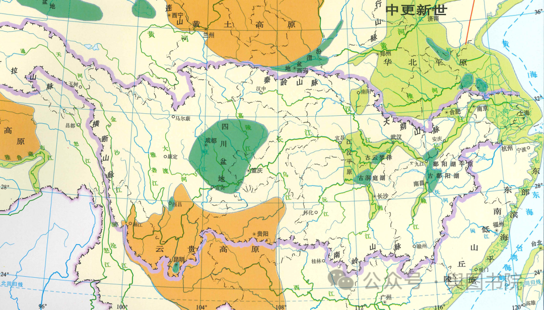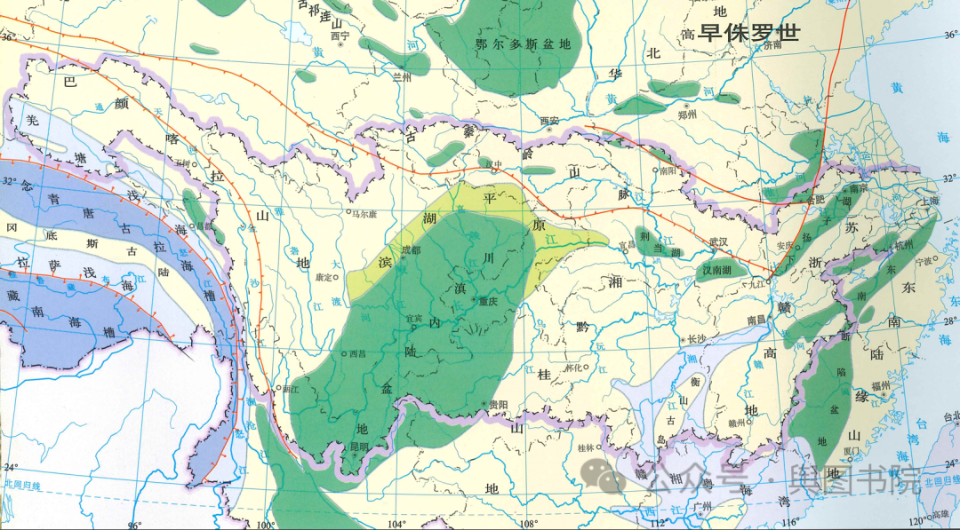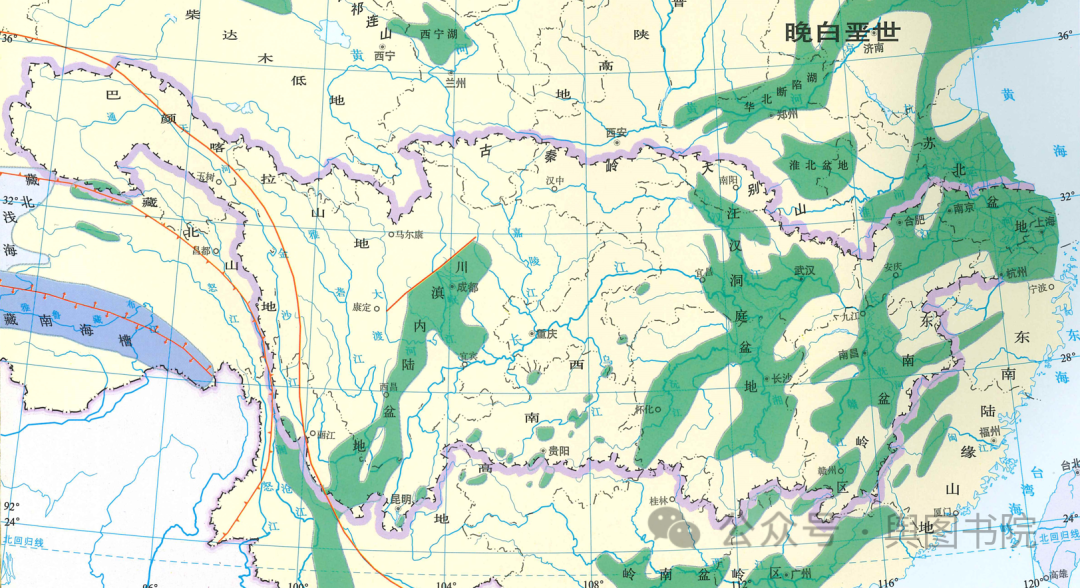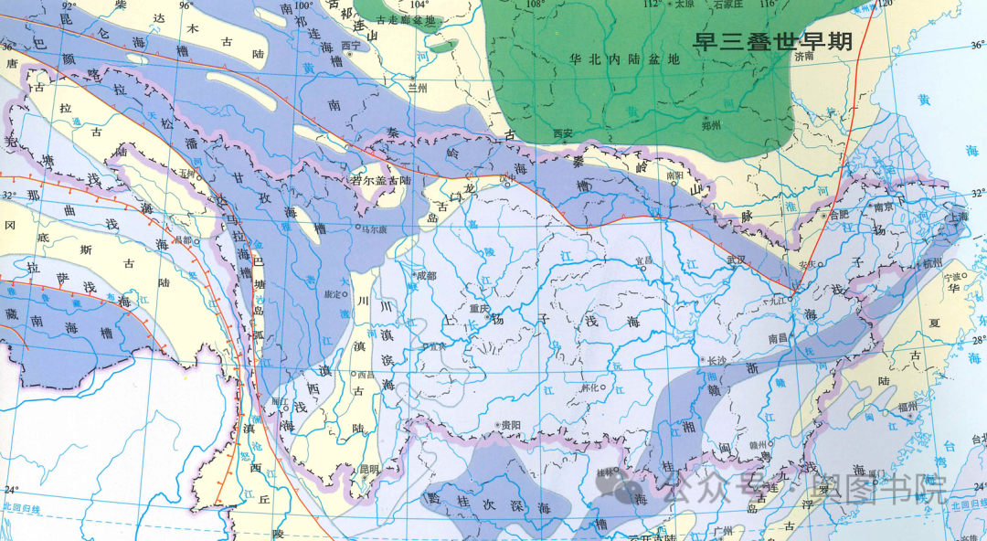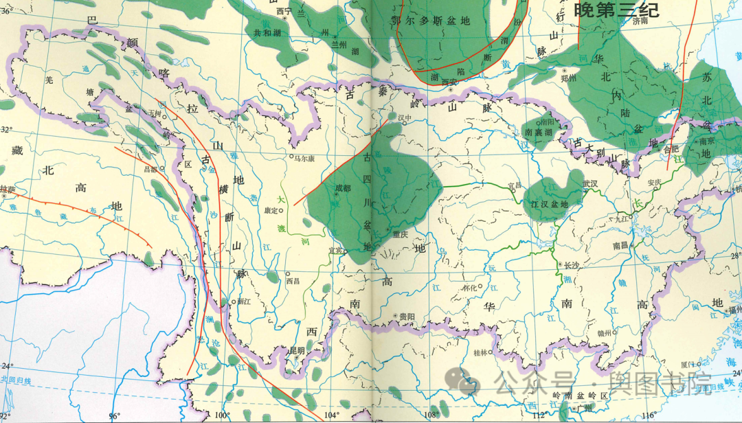 (晚第三纪(6500万到250万年前)长江流域古地理,长江发育进度50%)