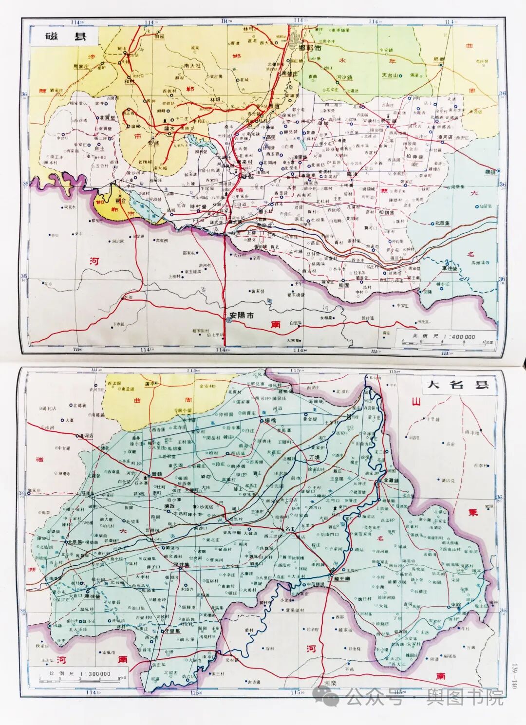 磁县在解放后划出一部分组建了峰峰矿区(后来这个矿区划入邯郸市),1958年的时候,又合并了临漳县,成安县两个县,形成图中格局。县南部还有一个邯郸市区的飞地。大名县也是历史悠久的府城,大名府从宋时便有。1958年,合并了魏县,元城两个县形成图中格局。