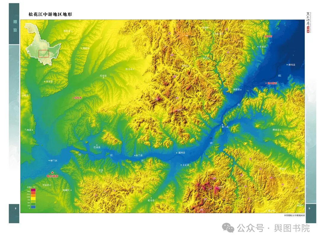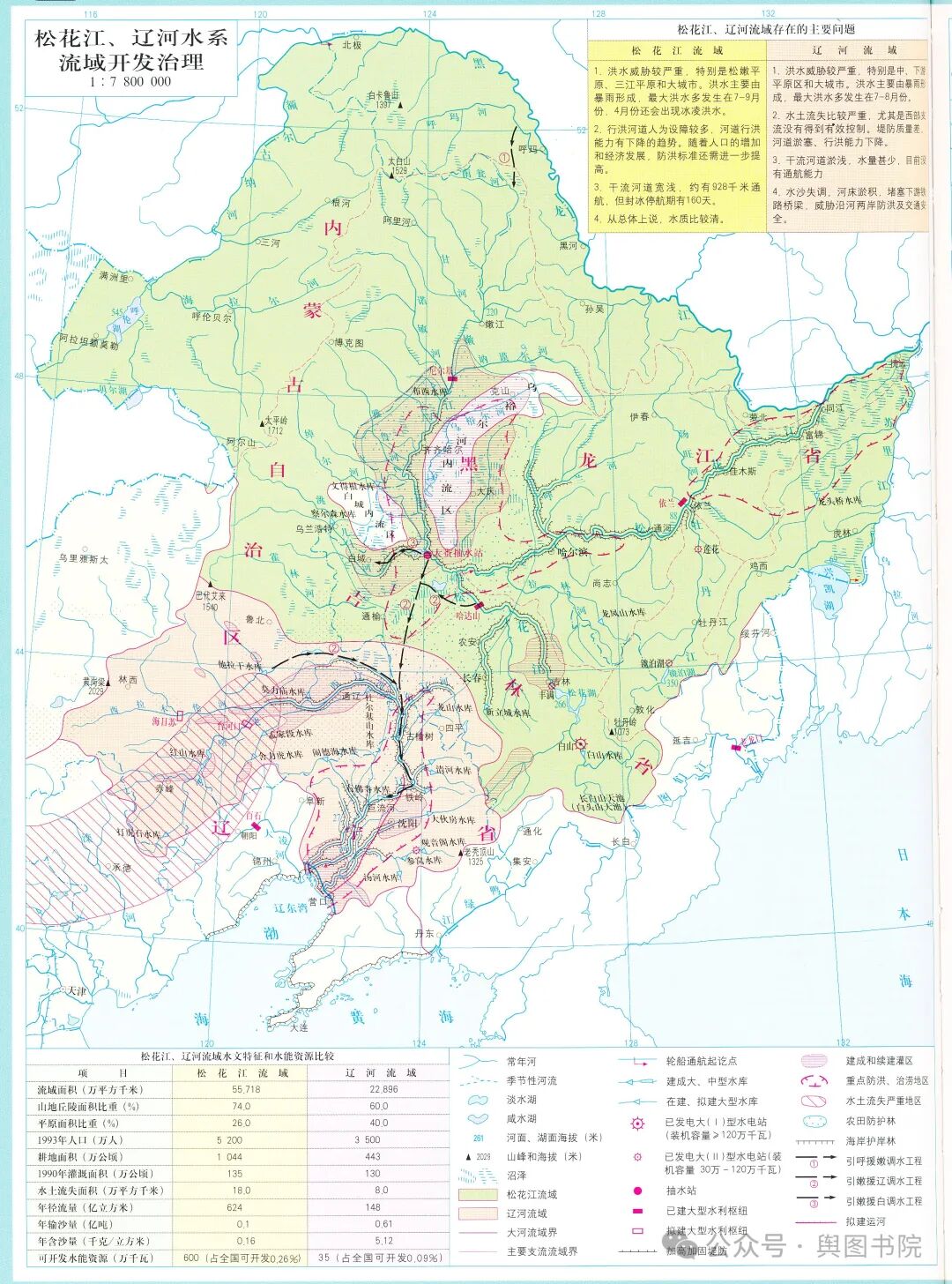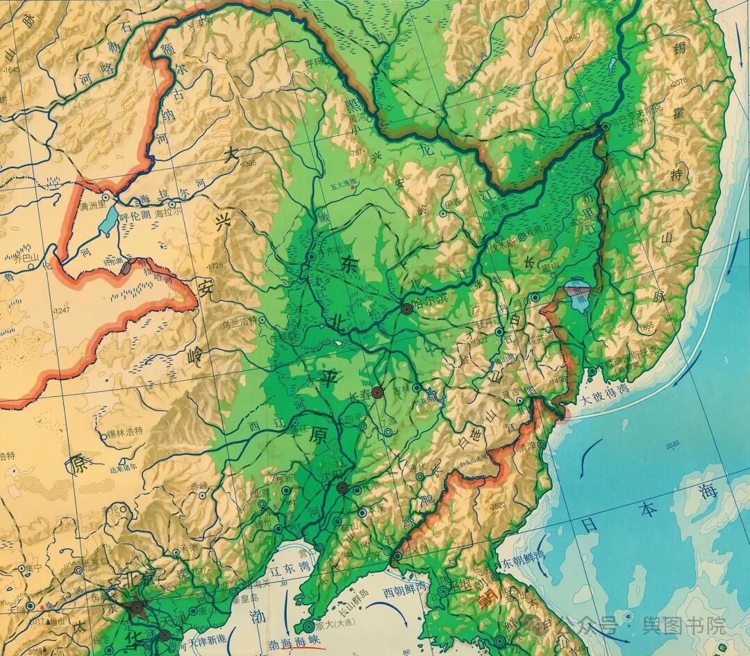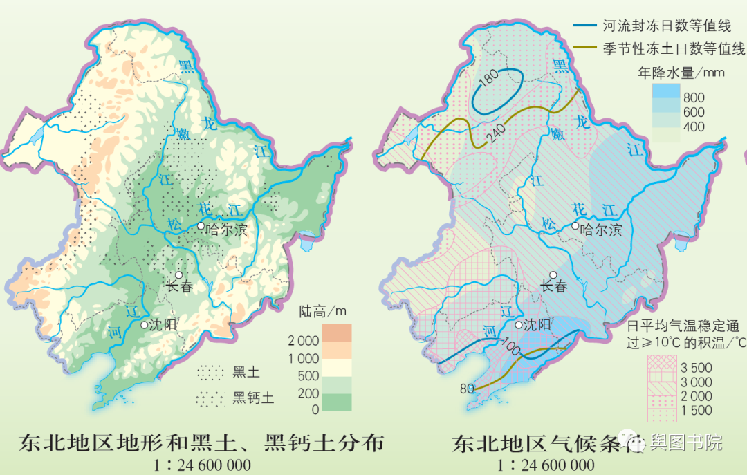 (中国地形-东北,松花江发源于长白山,汇集东北长白山,大小兴安岭之水,干流河道有一个急转弯,如同犁一样,耕耘的黑色沃土)