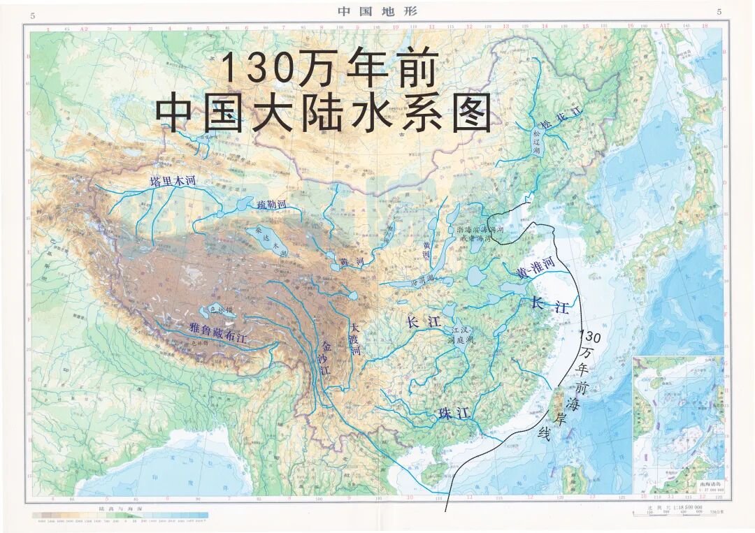 (130万年前中国水系图,作者制3图)