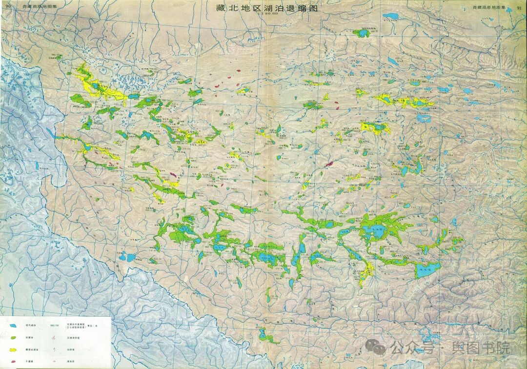 (藏北地区湖泊退缩示意图,实际上再更早时候,位于藏北湖群的古色林错是一个巨大的湖,后来水位退缩湖泊解体成诸多小湖)