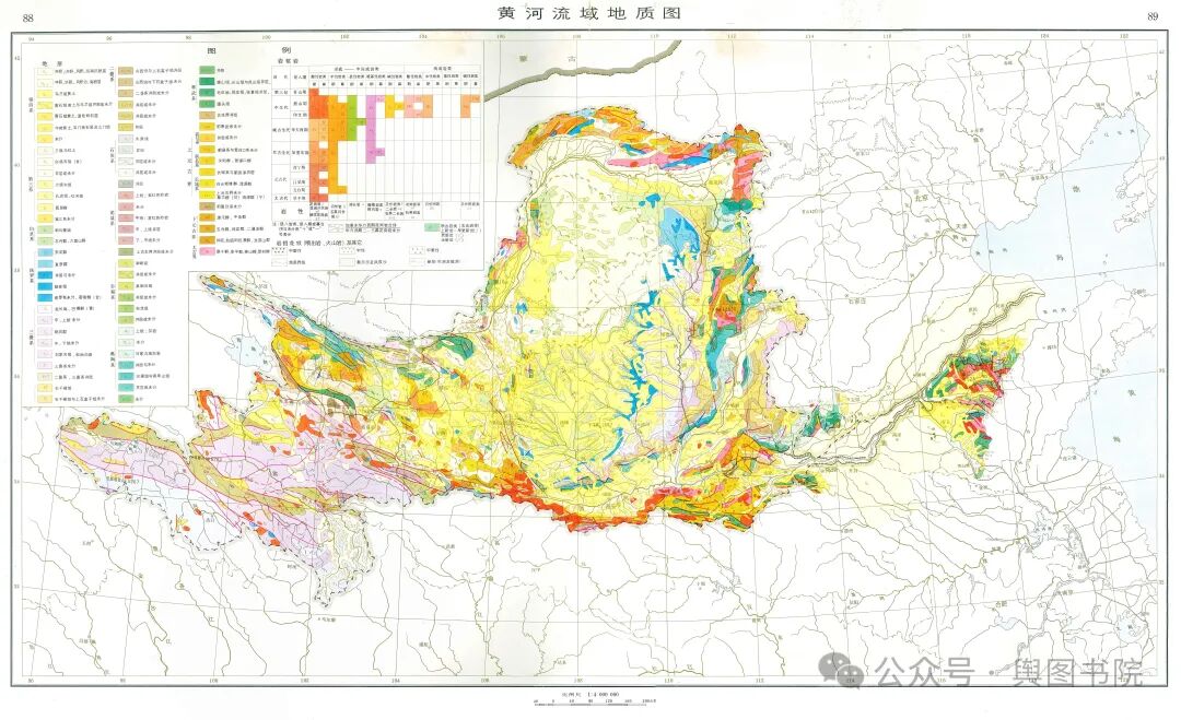 (黄河流域地质图,出自1989年黄河流域地图集。在中上游高原区,也镶嵌着第四纪湖相沉积,这些地层都记录着曾经的古湖,更多黄河流域自然地理戳链接:舆图鉴赏——什么是黄河)