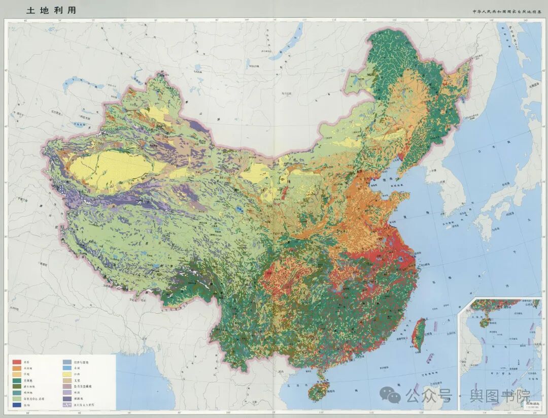 (中国现状土地利用图,1999年。中国还有大量光热资源优质的平地因为缺水而无法利用)