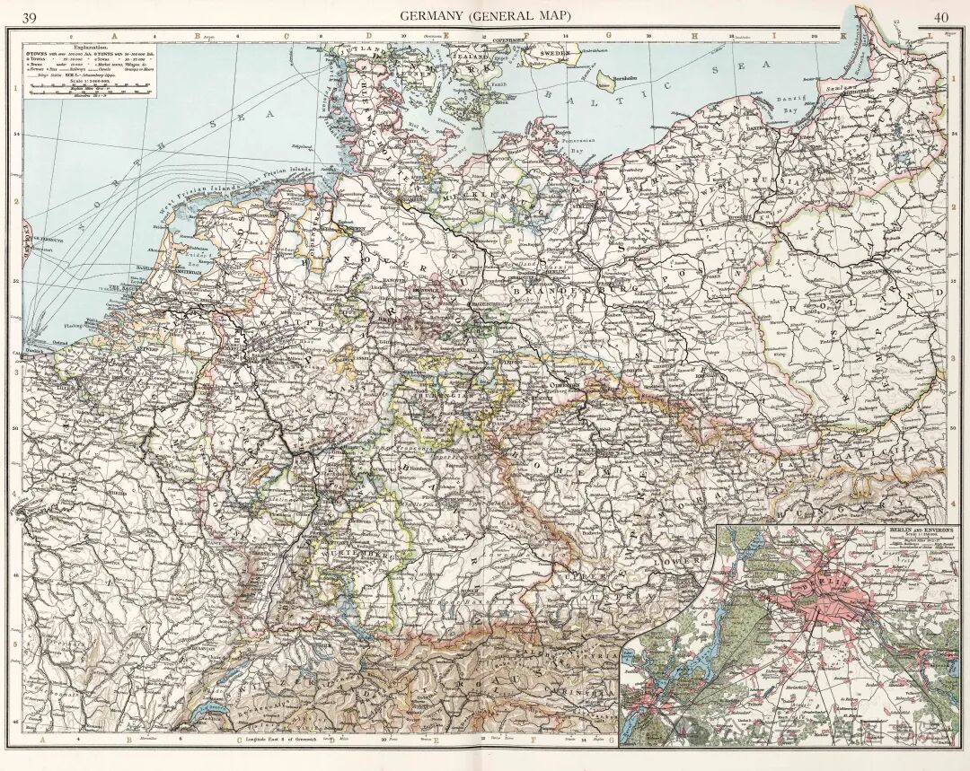 (德国地图,1906年,图中标注“canal”字眼的线条就是德语中的运河,据图可以发现,100多年前德国就已经建设了全国河网,连接境内主要大河,而日德兰半岛南部也有运河沟通,这是用于德国东西海岸线联通的运河)