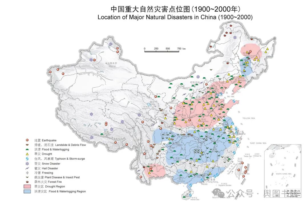 (中国自然灾害点位图,东部地区是经济中心,却深受水旱灾害困扰)
