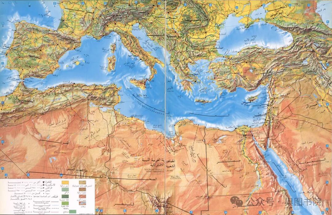 (北非-地中海地图,出自利比亚地图集,更多内容戳链接世界精品图赏析——1977年利比亚地图集)