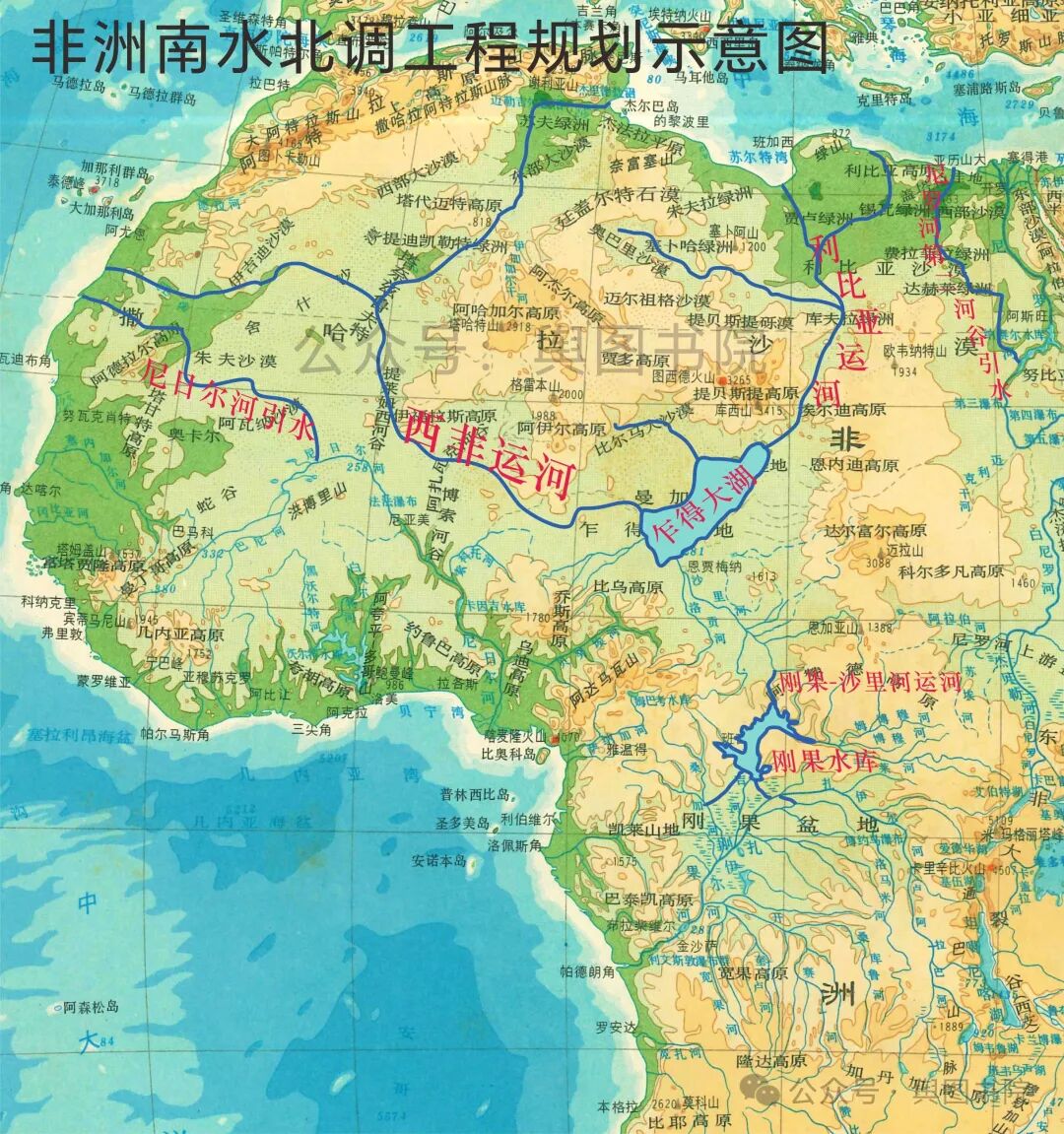 以刚果河为主力的非洲版南水北调工程,主要分为西线,中线,东线三个部分。刚果河负担中线工程。这个工程首先在刚果河北侧,中非一带修建刚果水库,将刚果河大量径流输送到这一水库,然后水库向北泄水,通过刚果-沙里河运河全程自流,流到沙里河,再通过沙里河这一天然河道补给乍得盆地,并填充博德莱洼地,形成超级乍得湖,以乍得湖为中心,通过利比亚运河和西非运河,兵分两路,全程大部分自流,开进撒哈拉沙漠,周围建有配套的引水渠,将这片不毛之地彻底改造。非洲拥有大片湿润区,又有地形优势,改造北非沙漠不是梦想。
