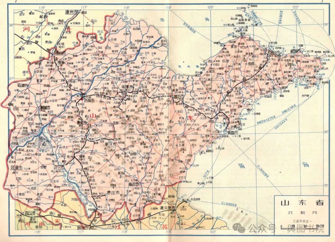 1952年,山东增加了张周市,潍坊市,德州市,威海市等建制市,而随着平原省撤销,江苏省组建,山东西部和南部省界恢复到传统省界。更多内容戳链接:舆图纪实——1952年中国分省地图。