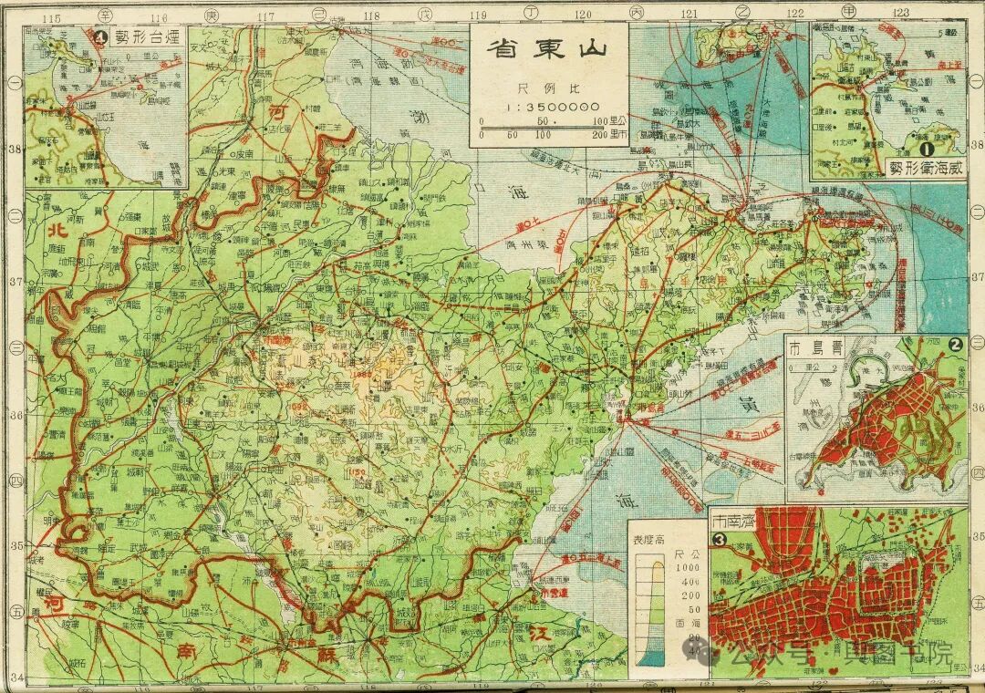 1946年山东地图,威海卫行政区和青岛直辖市重新出现。省界层面,和河南,江苏,河北的省界和今天都有一些差别。