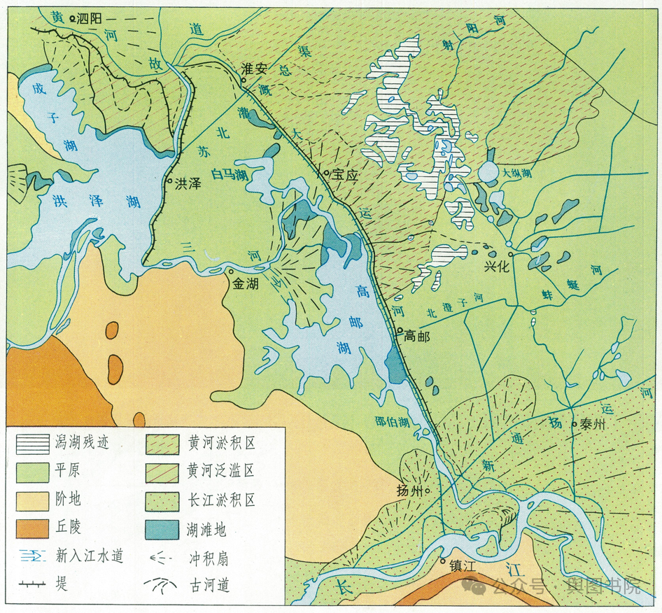 洪泽湖面积2060平方公里,比枯水时候洞庭湖鄱阳湖还要大。洪泽湖主要出水口原先是东流入海的水道,1851年黄河砀山决口以后,洪泽湖主要出水口变为入江水道,某种意义来说洪泽湖及淮河从此就变成长江支流了。