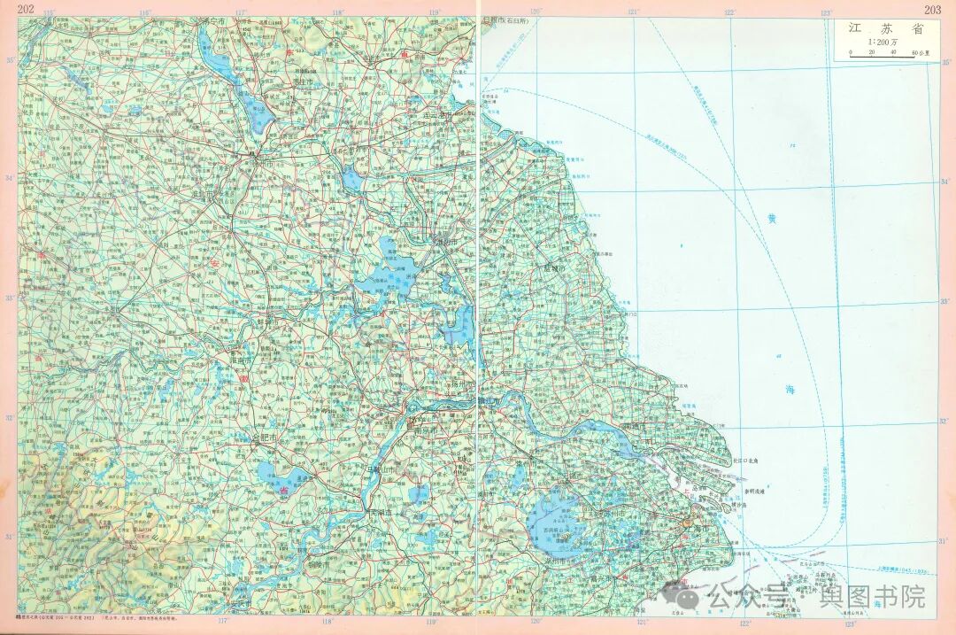 1954年,地图可见江苏省省界可以发现在微山湖,太湖有所调整,微山湖划给山东,太湖则全部湖面划入江苏。而嵊泗列岛划入了浙江省。更多1954年地图内容戳链接:舆图纪实——1954年的新华本国地图