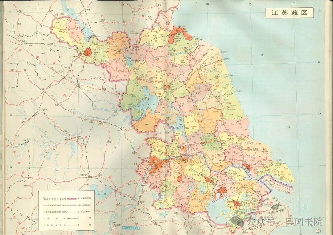1983年,江苏率先开展了地市合并,撤地设市和撤县设市的工作。江苏也是最早实现全面市管县的省份,行政区划改革走在了全国前列。不过在较早的地图上,如这个1991年地图,我们可以发现县级市也用类似地级市界限进行描绘,和地级市同等对待,地图上不体现“市管市”,后来,县级市在地图上逐渐和县保持一致,成为地级市管辖的区域。