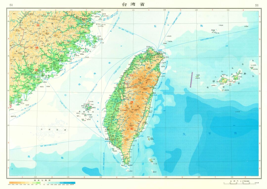 通过地形图我们还能发现,台湾省东部是中国唯一直面深海的沿海区域。这也是国土范围内高差最大的区域。
