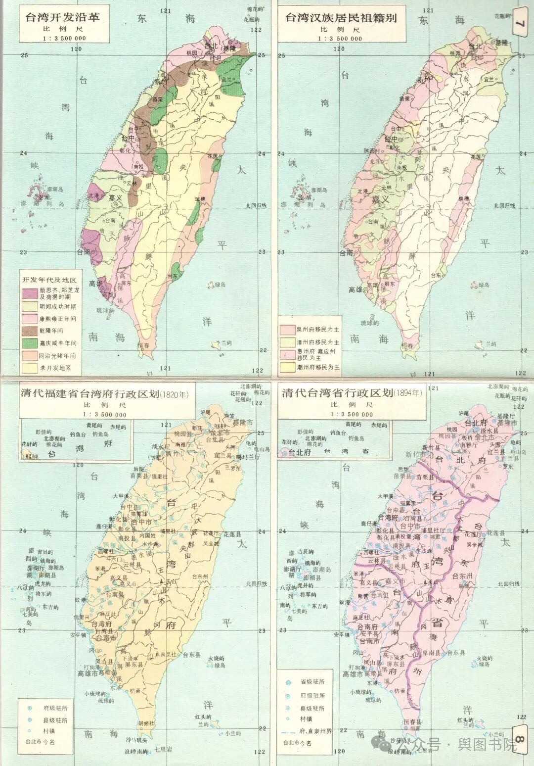台湾岛很早就有人类定居,很久以前,这里原住民就曾经使用简陋的航海工具走遍太平洋,而这里大规模开发始于明末,从郑芝龙等人登陆开始,这里涌入了大量东南沿海移民,并逐渐开始有了内地中原形式的格局。台湾省早期移民以福建,广东两省为主,集中在泉州,漳州,惠州,潮州等四个区域。清朝平台以后设置台湾府,归福建省管辖。台湾早期中心在今天台中,后来移到台北。清末时候设置台湾省,管辖台北,台湾,台南三个府和台东直隶州。1895年因为甲午战争战败而割让给日本,直到1945年光复。