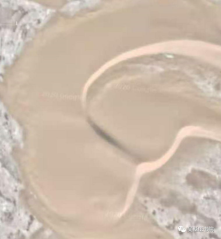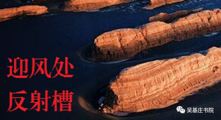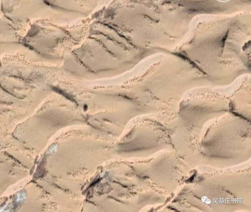 首先,我们要明确,这种侵蚀塑造跟新月堆积沙丘形态形成是两码事。在这种构造中,宽大的那一面是迎风面,我们不仅可以看到迎风处痕迹,还能看到迎风处扰动沙子形成的漩涡。如图所示。这里可以更加清晰指向风向。