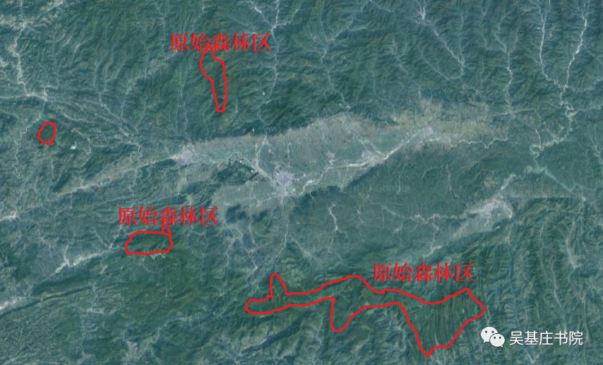 上图展示了秦巴山区的一段,对于山区地区来说,植被是以树林为主的。但是,不同发育状态的树林,在卫星图中是有差别的。一般卫星图这一层级的影像都采用夏季视角,所以图中植被都是绿色,但是对于原始森林和次生林,略有不同。一般来说,原始森林的绿色更加深厚,色调偏暖,而且对地貌的遮盖程度大,不像次生林这样“瘦骨嶙峋”,这是由于,原始森林状态下,群落演替是达到顶界的状态,是当地水热条件下能发育的最大生物量的群落,所以人工林,次生林的蓄积量是不如原始森林的。森林的演替速度比生长速度慢多了,一个稳定的树林,需要经历几百年至一千年的时间的演替。
