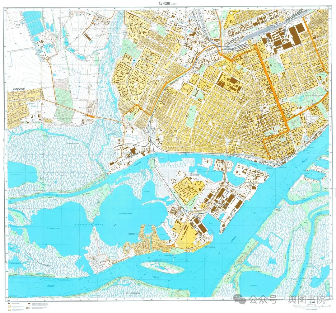 从赫尔松1比1万地形图还能看出,赫尔松的城市建设是在三角洲之上的,河口区域实际上也是一片野生自然区域,没有什么城镇建设痕迹。