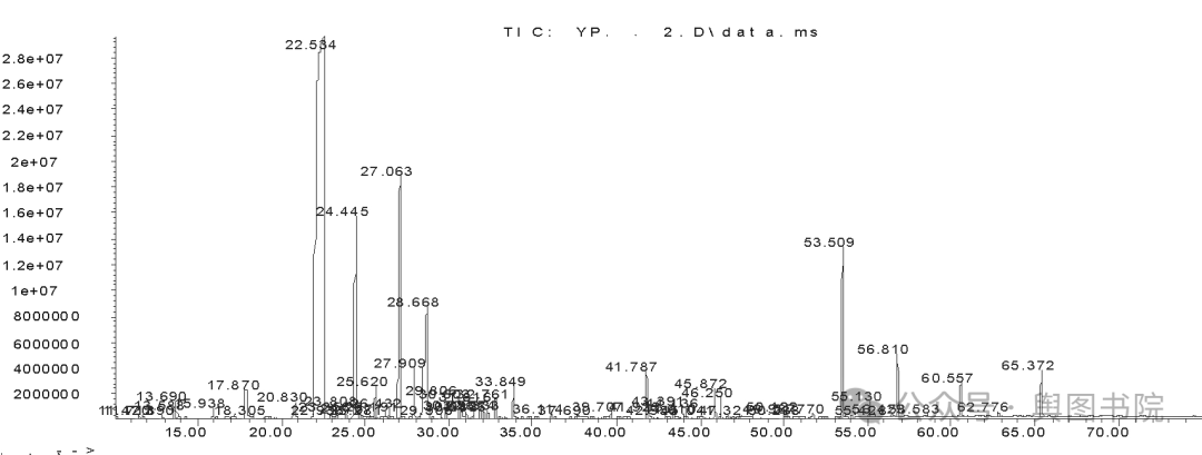 (石楠花提取物挥发性成分质谱分析总离子流图,质谱条件: 电离电压70ev,溶剂延时10min,扫描范围35~650amu)