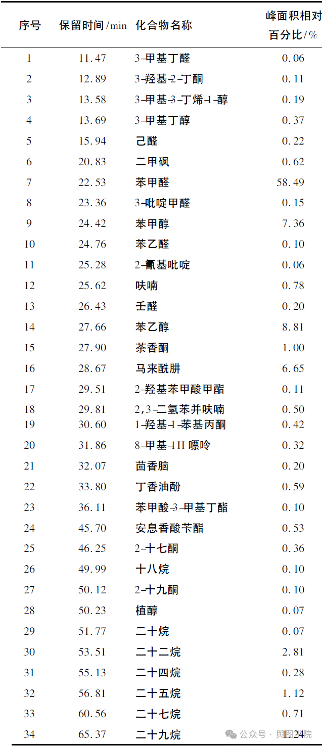 (石楠花挥发成分气相色谱分析示意,气相条件: 色谱柱DB-5MS(30mⅹ0.25 mmⅹ0.25μm) ,进样口280℃,进样量1μL,分流比10:1,载气氦气,恒流模式,流量1mL/min,程序升温40 ℃,保持3 min,以5℃/min升至300 ℃,保持20min)