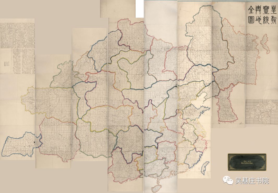 小图中的全国概况。我们看到了,这幅图不仅仅包括内地省份,还包括边疆地区。在当时,朝鲜也是画作中国领土的。边疆地区,画的省份要多一些,比如说今天的西藏自治区,在当时划分为前藏,后藏,阿里。今天的克什米尔,在当时也主要位于阿里地区,但是后来也被英属印度吞并了。新疆分为5部分,蒙古分为6部。蒙古也就是乌里雅苏台,在1946年脱离了中国。新疆失去了一部分领土,但大部分在今天仍然属于中国。