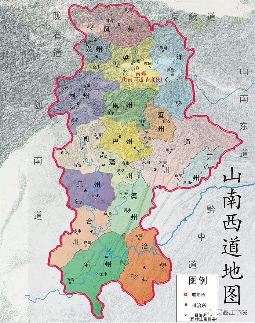 上元初年(760-761年),置山南西道节度使,治梁州,在今陕西南郑县东二里。领梁、洋、集、壁、文、通、巴、兴、凤、利、开、渠、蓬十三州,兴元初兼领阆果金三州,而文州别隶西川,今陕西汉中道及四川东川道嘉陵道北部之地,其后分合不一。大顺初,杨守亮拒命,寻为李茂贞所并,天复初,双并于王建,北宋亦置山南西道节度,后罢。
