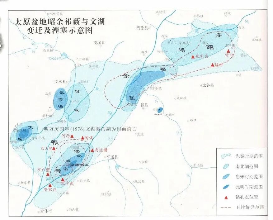 汾河平原和关中平原是一个巨大的地堑,在晚第三纪的时候,汾渭盆地一带形成了巨大的咸水湖(也就是汾渭湖)。这个咸水湖的形状,大小和构造很像今天的贝加尔湖。是一个新月形状的大湖。到了第四纪,由于黄土高原大量泥沙注入汾渭湖,汾渭湖被几千米厚沉积物堆积将满,湖泊几近瓦解消亡,再加上下游的古淮河切穿三门峡,湖水最终泄走,古湖彻底消亡。而山西汾河流域的几个小盆地,由于排水不畅,残存了一些湖泊系统。这些湖泊系统在历史上长期稳定存在。
