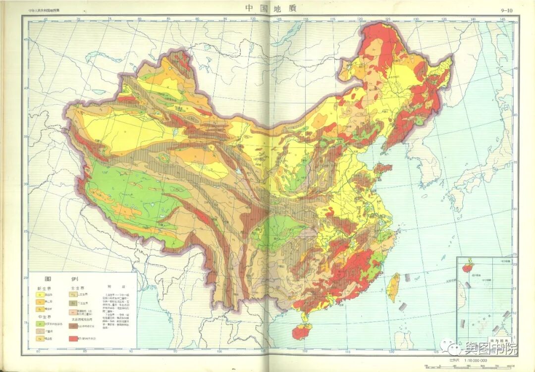 地质图采用国标着色,地图油墨质量还是不错的,历经这么久依旧这么强的 色彩饱和度。地质色卡一般采用国标色卡,一般来说,浅色表示年轻或者沉积地层,深暗色表示古老地层,红色是火成岩,淡色是变质岩等等。这幅图可以大致体现中国的地质分布。