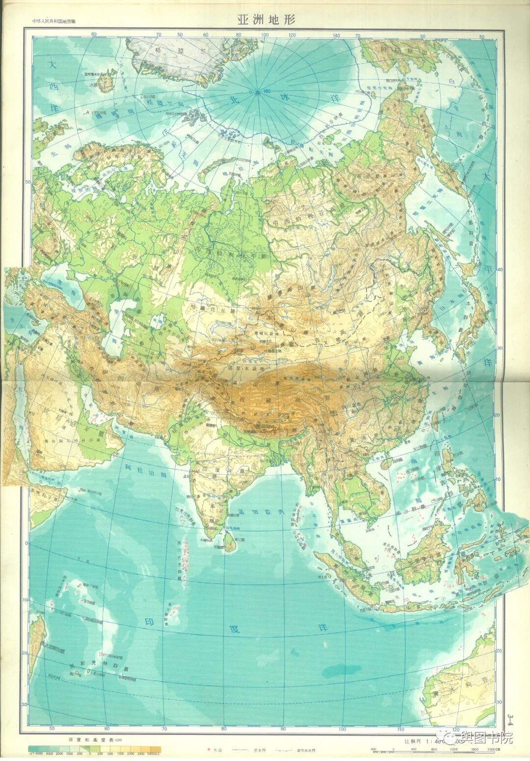 总图部分综合介绍了中国的自然地理和人文地理相关情况。首先是亚洲地形图,由于受苏联影响比较大,这个图集的地形图的描绘风格接近苏联地图的风格,采用中性色调色卡配合等高线分层设色和地貌阴影绘制地形图,等高线采用深色实线绘制。