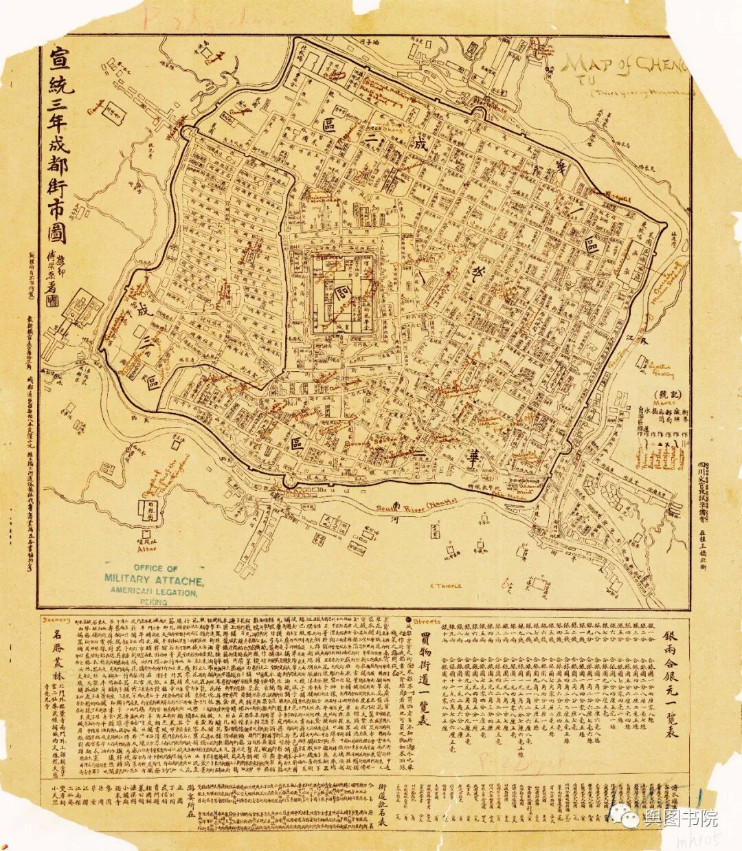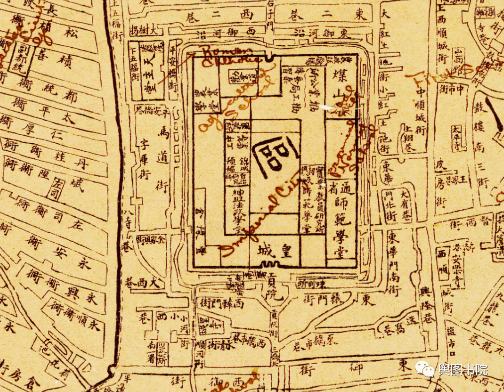 这幅图绘制于1911年,是清王朝风雨飘摇的最后一年。原图根据印章判断藏于美国在北京的使馆,图中重要的信息有手工加的英文注释。