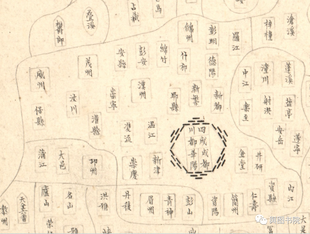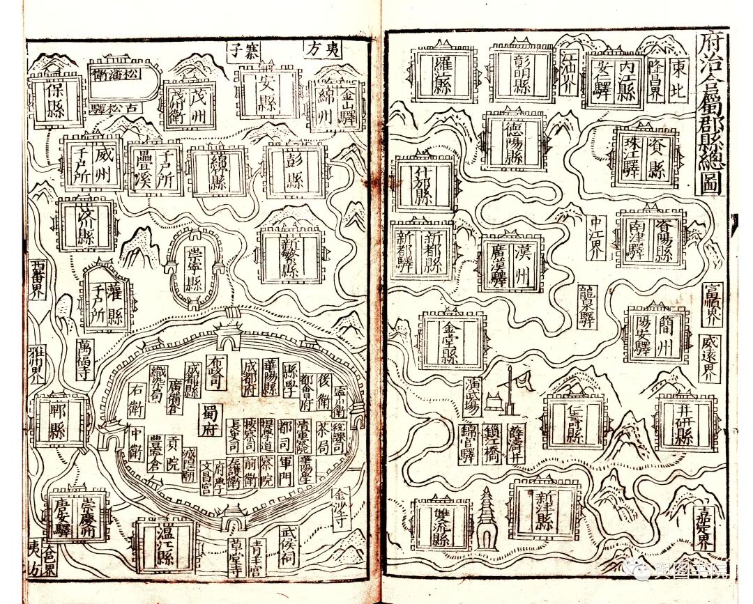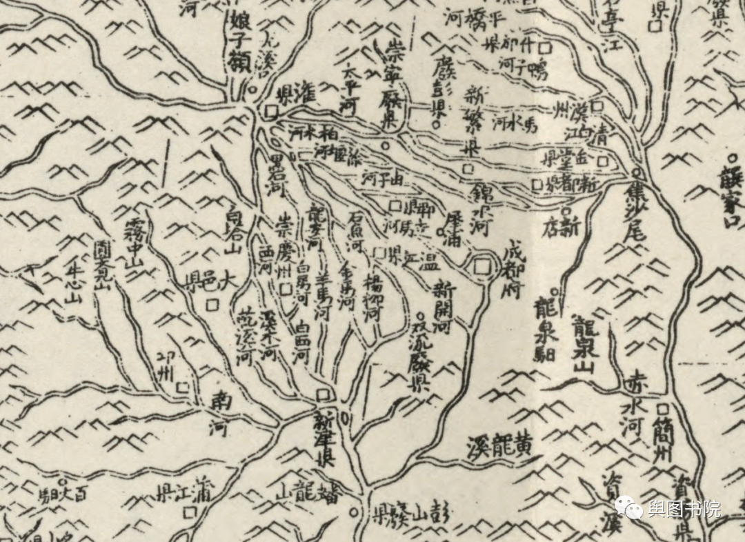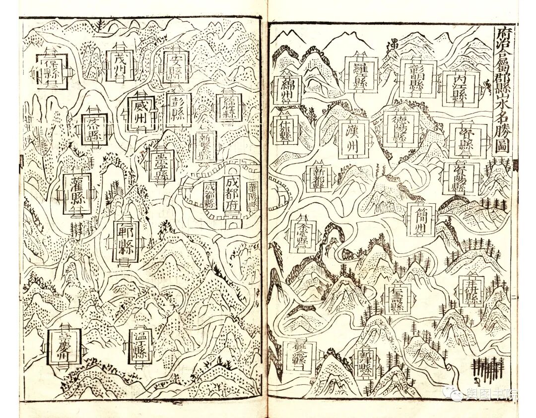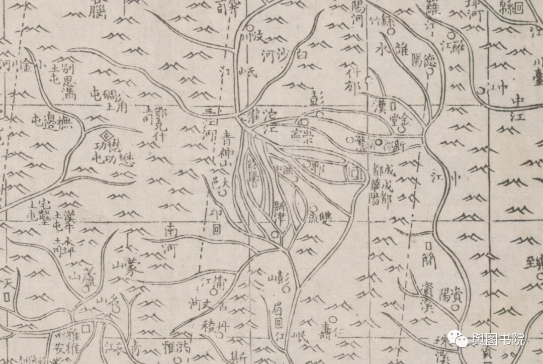 1719年皇舆全览图,是中国地图历史上的巨作,地图结合当时最先进的测绘技术,并得到西洋传教士帮助,绘制出这一幅精美的地图。全国地图最初绘制的比例尺是1比140万,也是相当精确的一个地图。上图中,都江堰冲积扇的各个叉流河槽清晰可见,地名和地理要素的绘制相当精确。山脉采用概念山形绘制,简约明了。