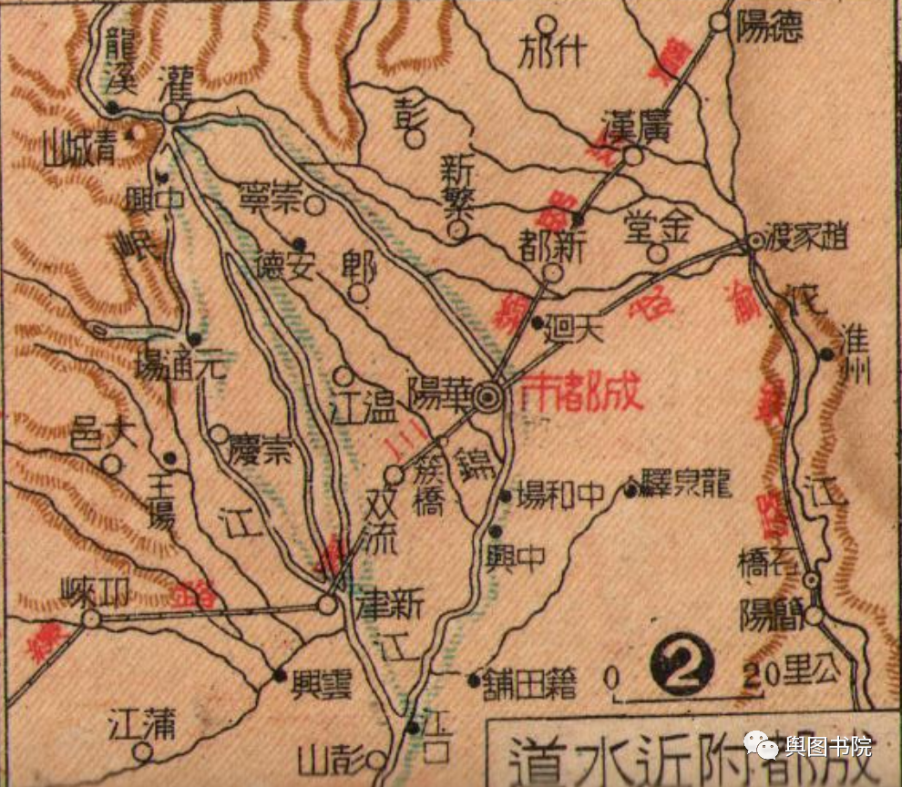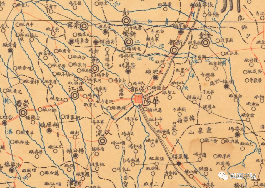 1916年中华帝国时期地图,此时中国废除了府这一级区划,存留了县一级,成都城就是当年的两个附郭县,成都华阳的县城。可以看出,成都当时公路线,规划了东北和东南方向两条。