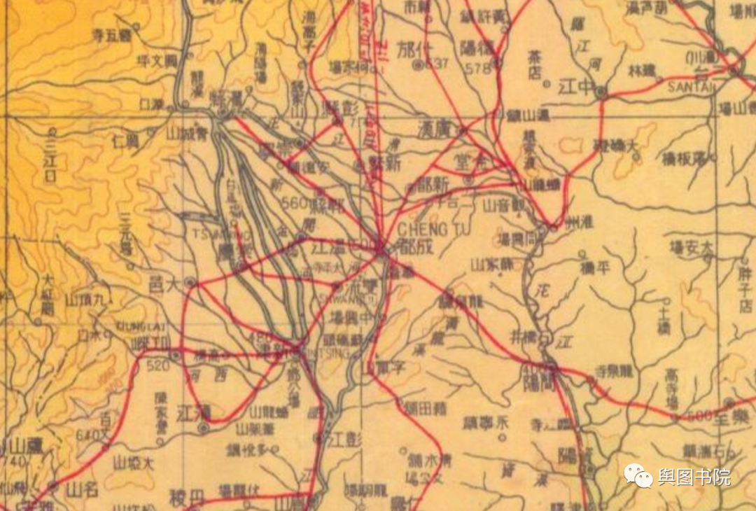 1938年地图。此时抗战爆发,四川作为大后方,至关重要,成都迎来了交通线和城市建设的高潮。