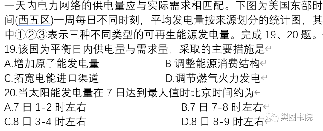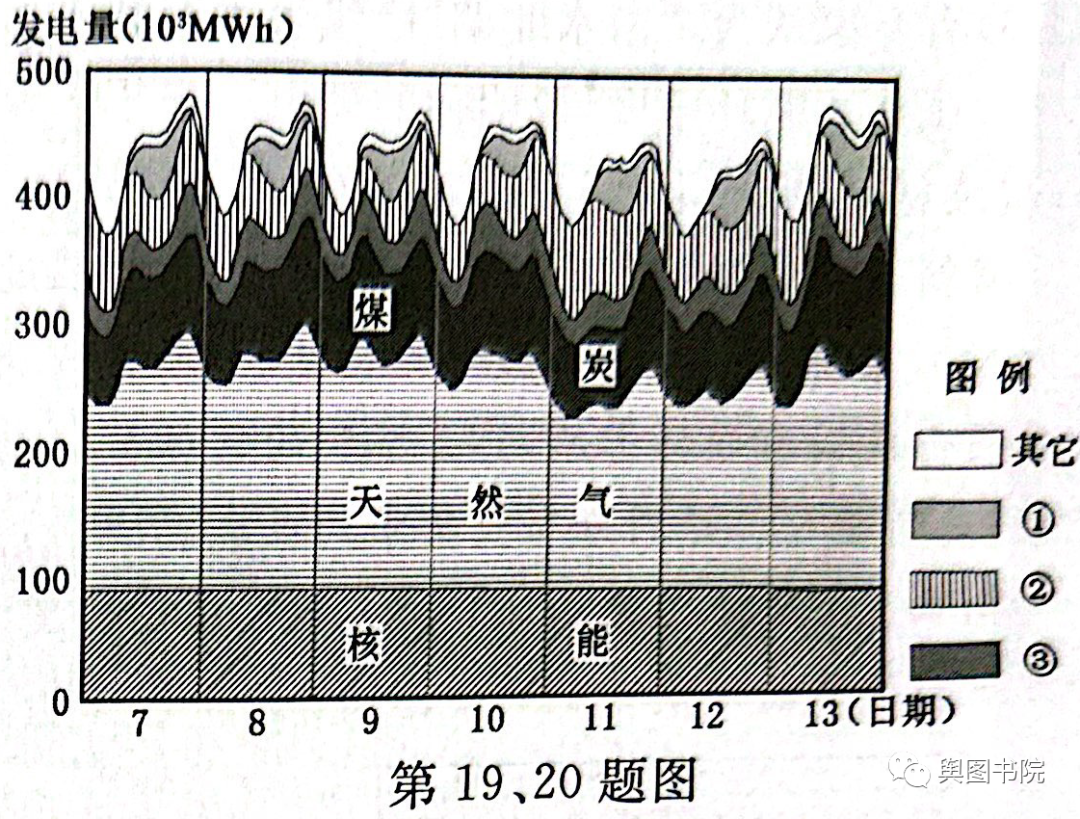 19题旨在考查从图中读取信息能力。图中核能能量占比稳定,燃气波动最大,因此燃气是最主要的电网调峰的能源方式。20题考查基本的时区换算,北京时间所在时区是东八区,和西五区差13小时。